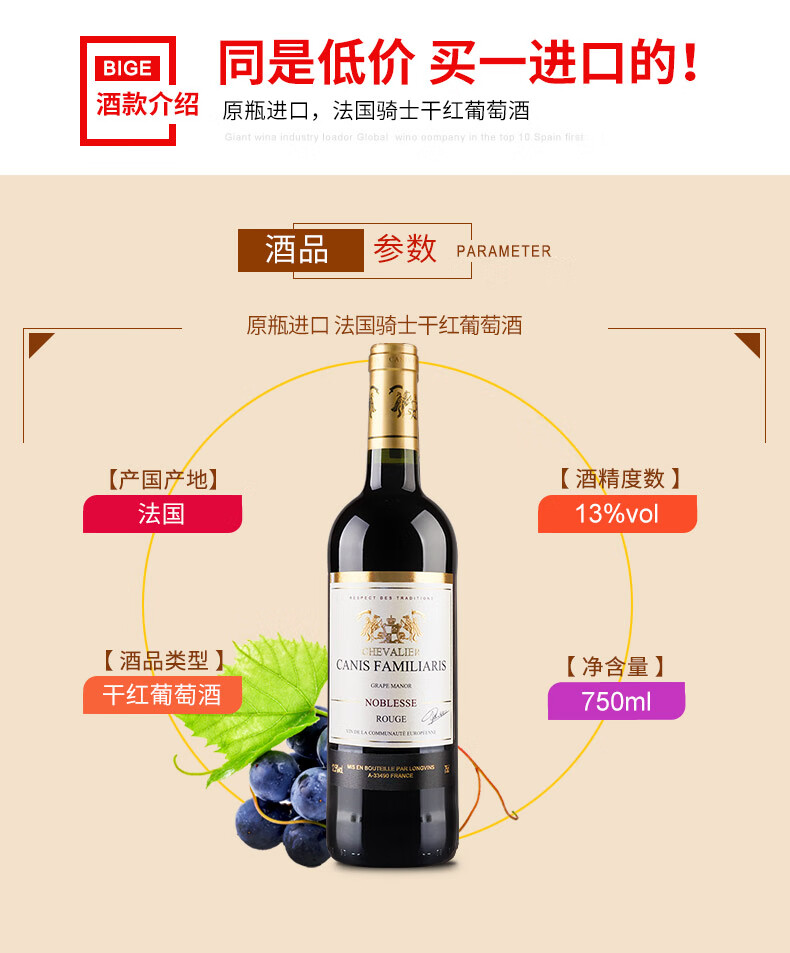 法国进口红酒 布多格骑士干红葡萄酒礼盒750ml*6支装
