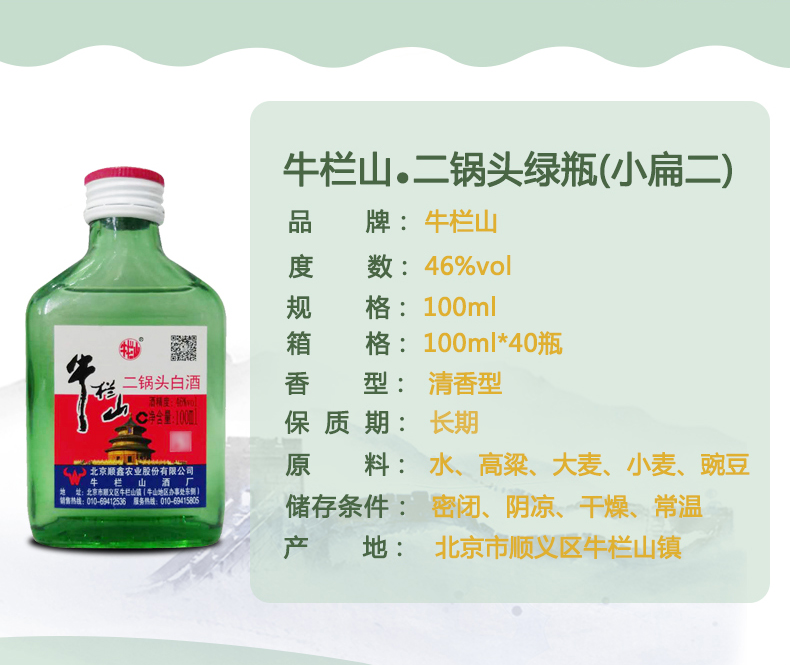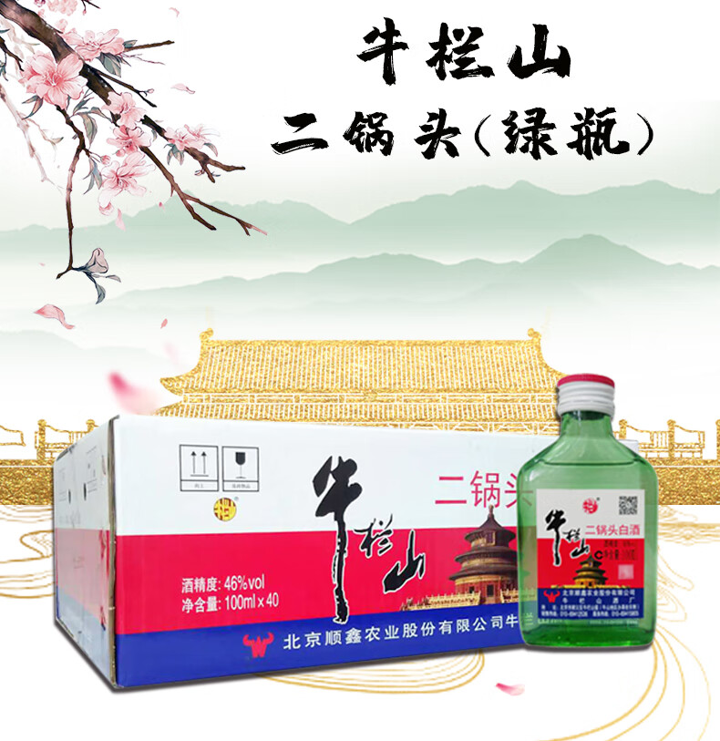 包装:整箱装;容量:375mL及以下;香型:清香型;度数:40-49度;香型:清香型;产地:北京;酒精度:46%vol;包装:整箱装;产品重量:10500g;容量:100ml;包装清单:牛栏山 白酒 清香型 二锅头 绿瓶 小扁二(扁瓶)46度 100ml*40瓶 整箱装;