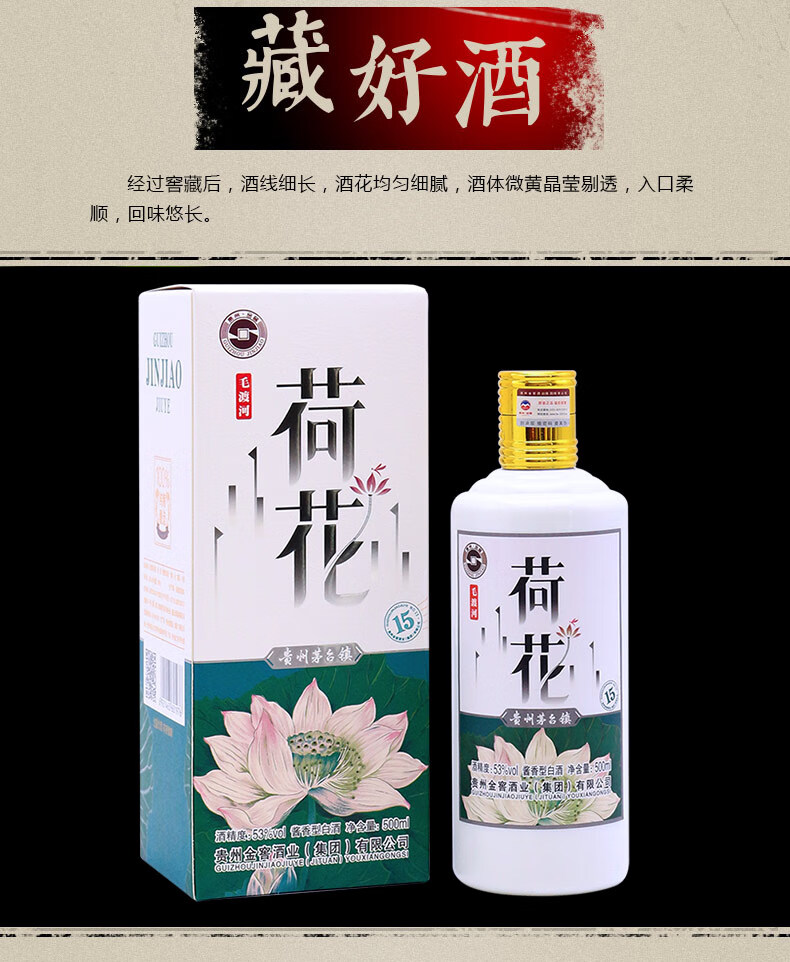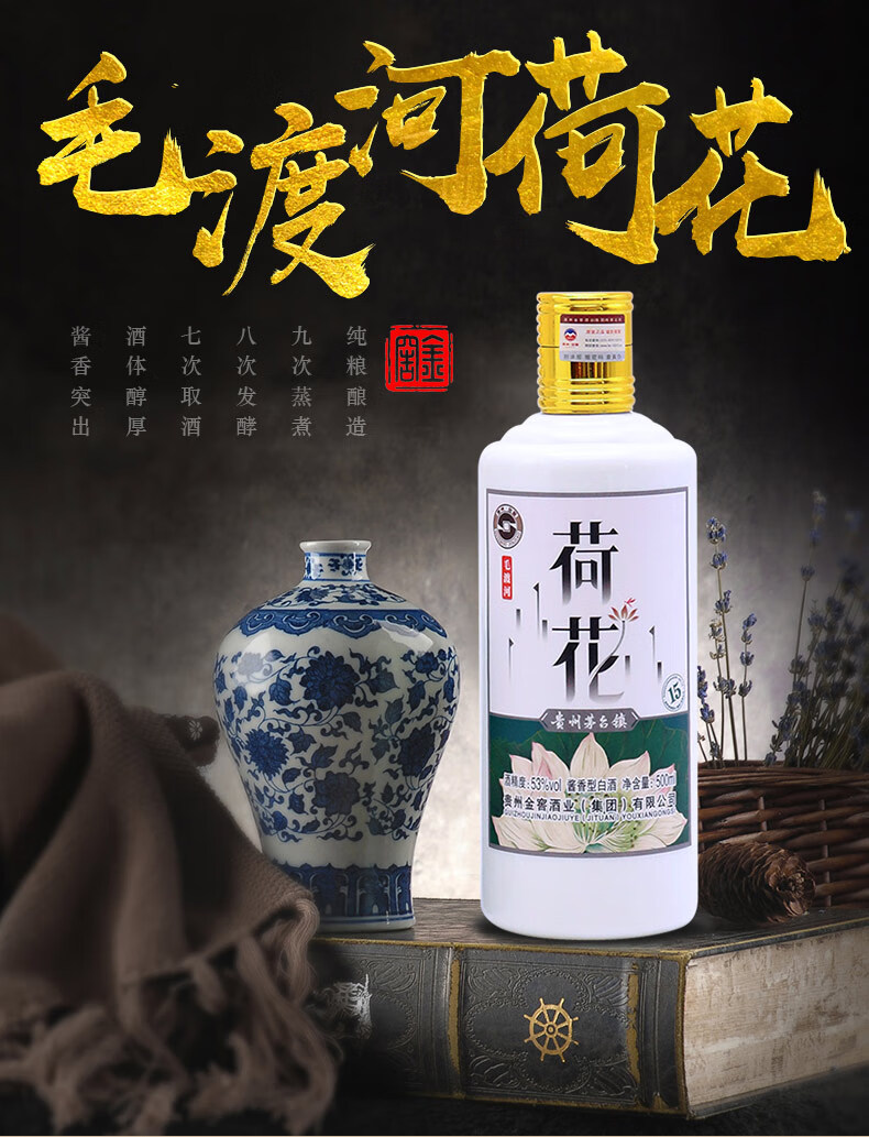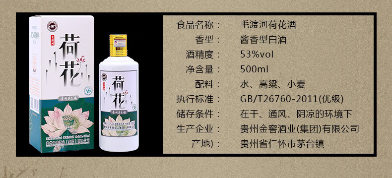 包装:整箱装;容量:500-749mL;香型:酱香型;产地:贵州;度数:50度及以上;酒精度:53%vol;容量:500ml/瓶;产品重量:7500g;包装清单:手提袋3个,毛渡河荷花酒6瓶;