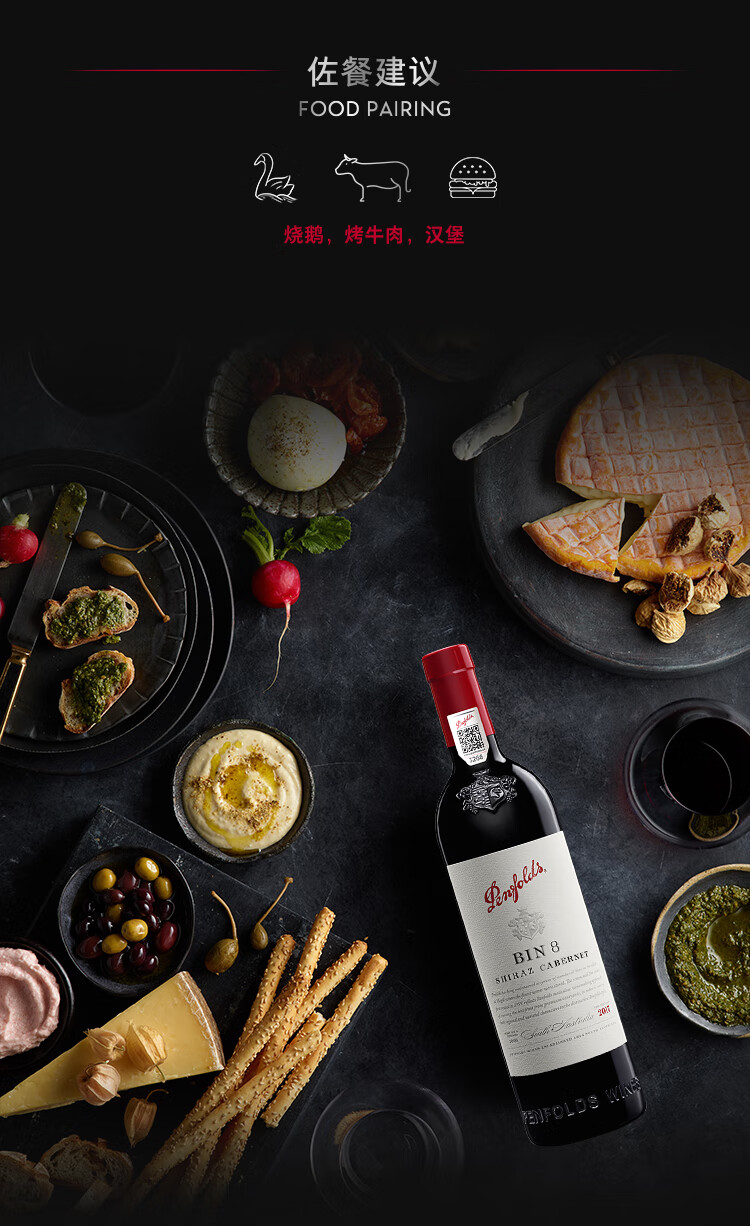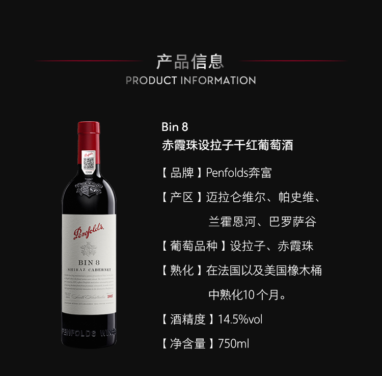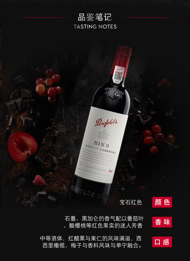 奔富Penfolds红葡萄酒BIN8赤霞珠设拉子 750ml*6瓶整箱装 澳大利亚进口红酒(新老包装随机发货)
