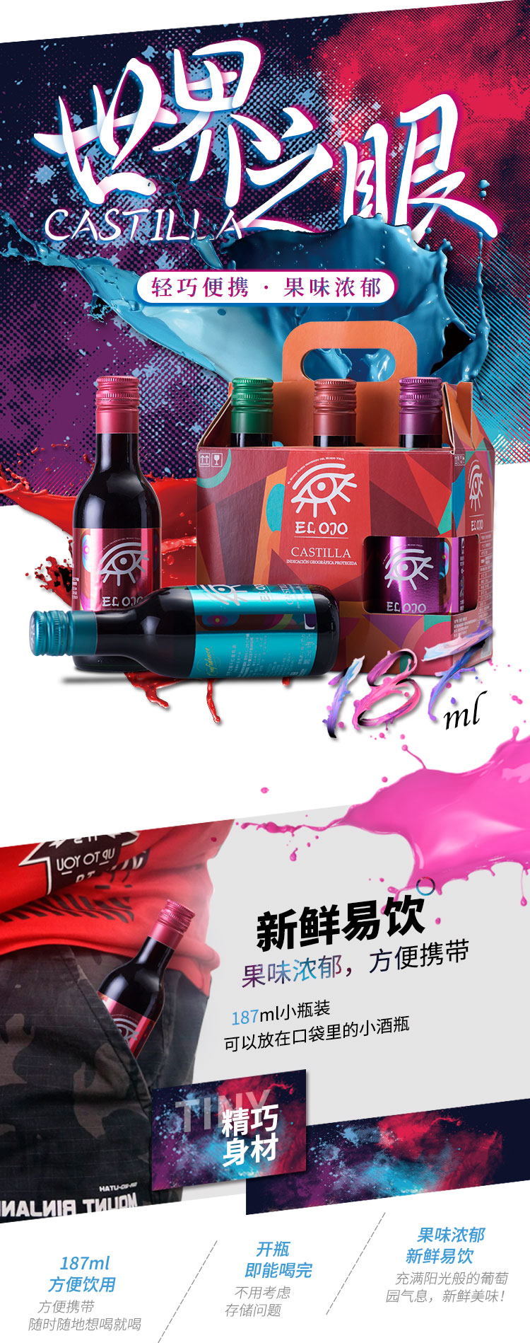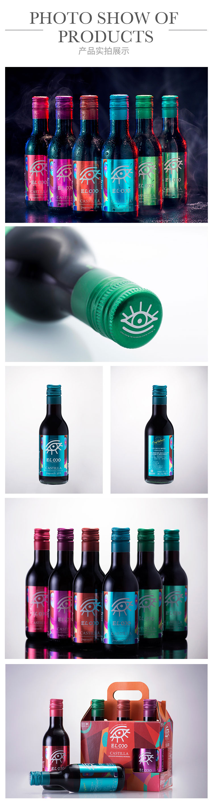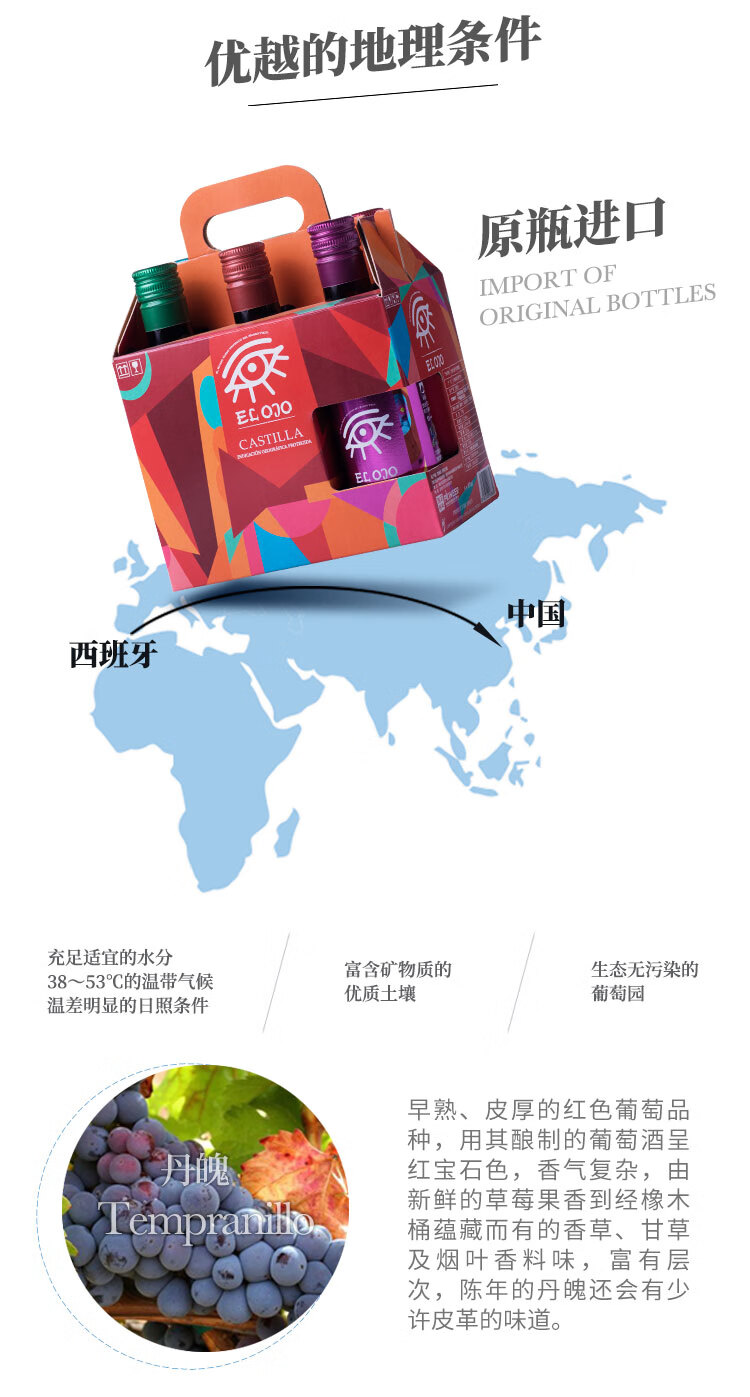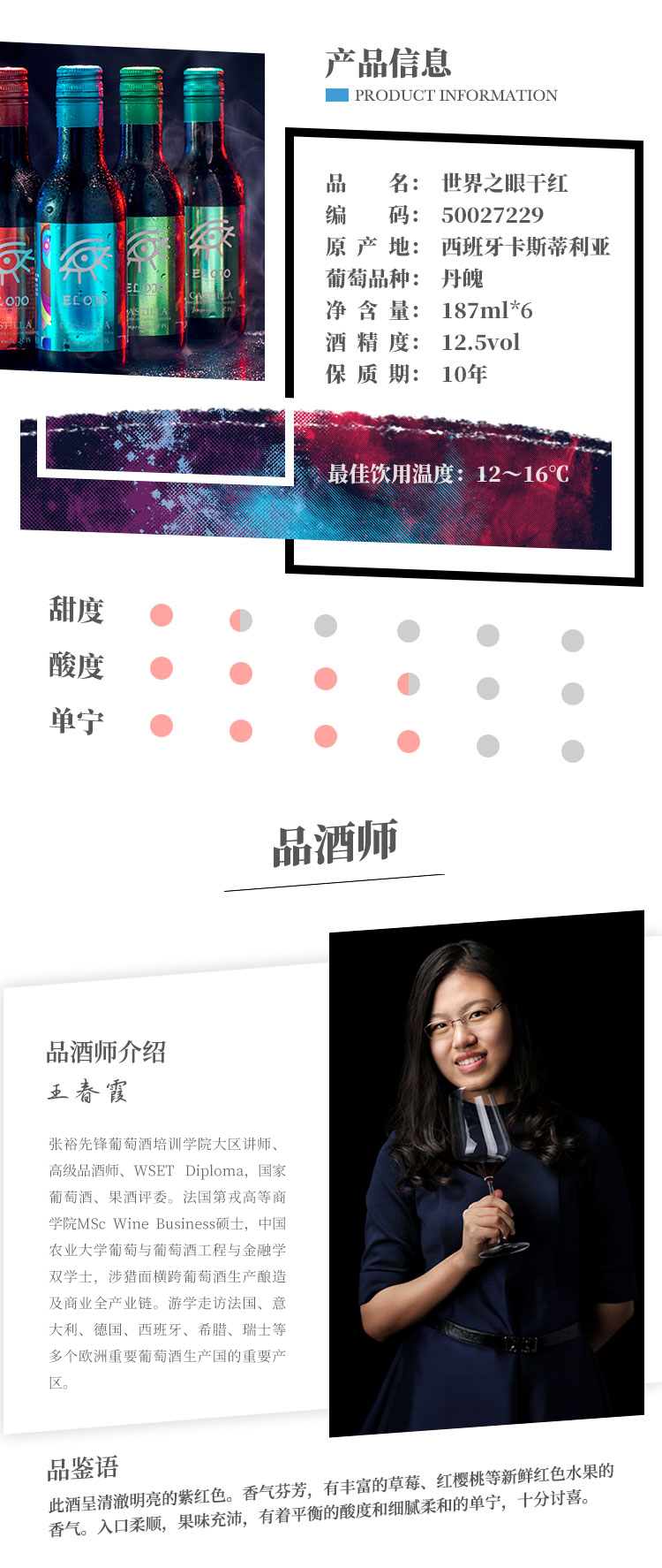 颜色:其它;采摘年份:2018年;口感:柔和;特性:精品葡萄酒;国产/进口:进口;适用场景:家庭聚会,礼节拜访,商务宴请,婚礼婚宴,情侣约会,自斟自饮,闺蜜私语,派对活动,收藏;包装:小酒版;酸度:低酸;类别:红葡萄酒;葡萄品种:天帕尼罗(Tempranillo);类型:静止酒;香型:花香,果香;产地:西班牙;容量:100-187mL;甜度:干型;保质期:10年;酒精度:12.5%vol;原产地:西班牙;存储方法:避免阳光直射,5℃~25℃干燥通风处卧放;容量:187ml;产品重量:2.1kg;包装清单:世界之眼干红葡萄酒礼盒装187ml*6;