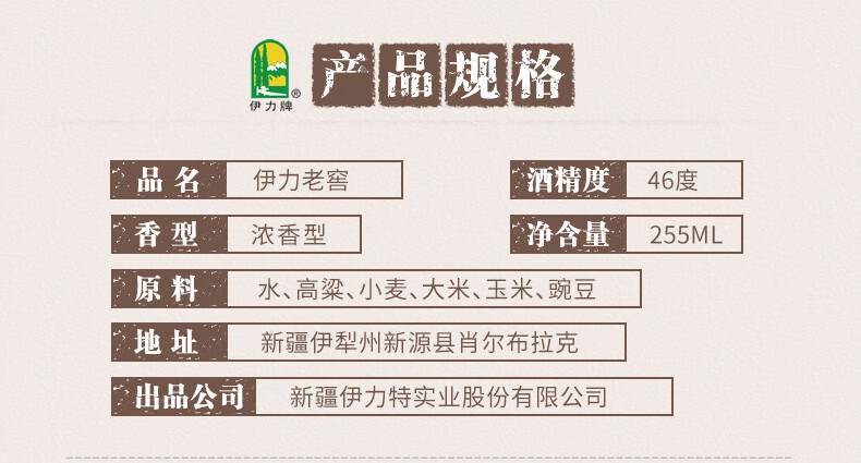 包装:整箱装;容量:375mL及以下;香型:浓香型;产地:新疆;度数:40-49度;酒精度:46%vol;容量:255ml;产品重量:7400g;包装清单:伊力特 伊力老窖 46度浓香型255ml*10整箱装;