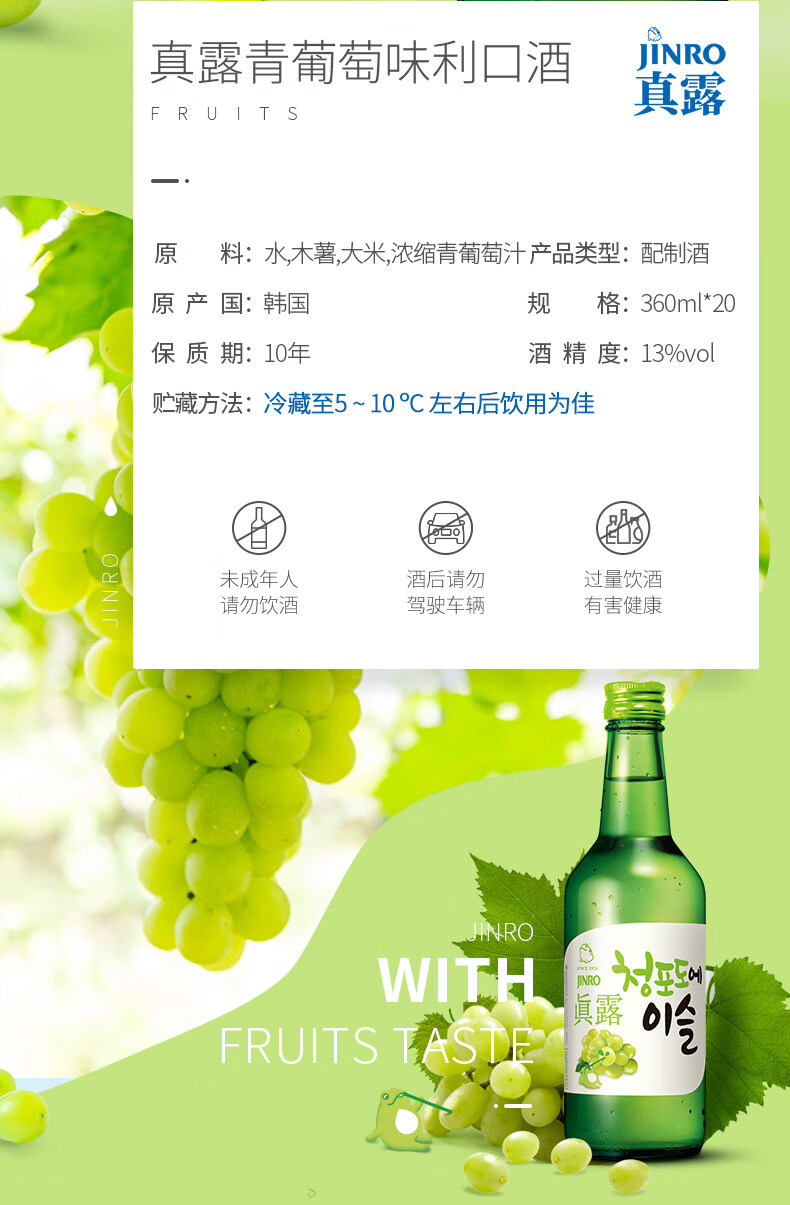 适用场景:自斟自饮,家庭聚会;包装:其它;容量:1L及以上;国产/进口:进口;产地:韩国;原料:水、木薯、大米、浓缩青葡萄汁;保质期:3650天;酒精度:13%vol;存储方法:放置于阴凉处;产品重量:13.6kg;包装清单:真露(JINRO)烧酒 韩国进口13°青葡萄味 360ml*20瓶 整箱装;