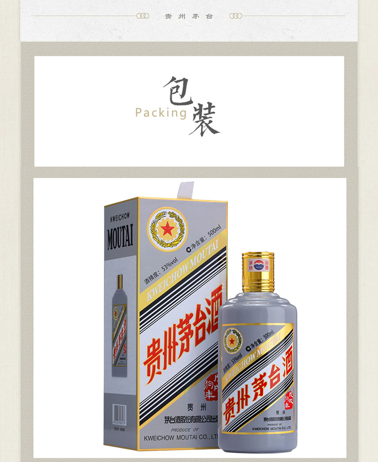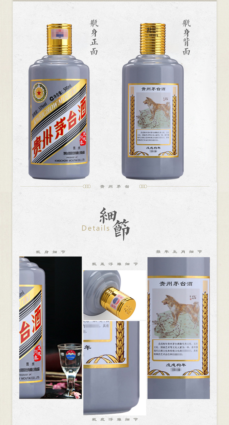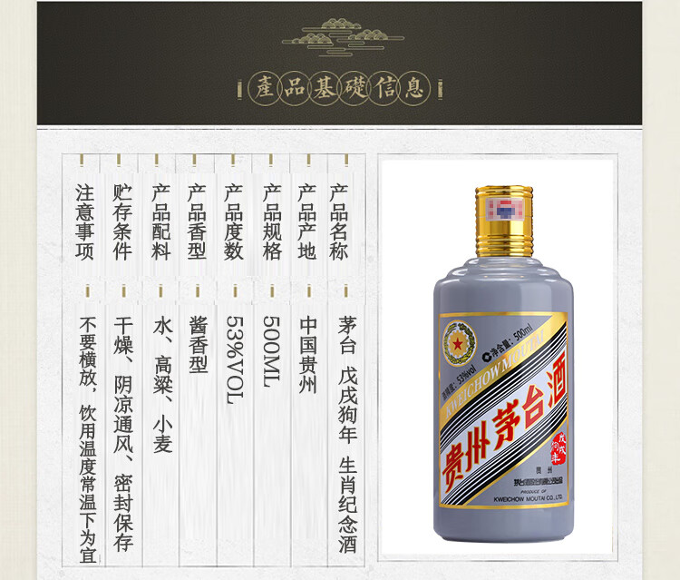 包装:瓶装;容量:500-749mL;香型:酱香型;产地:贵州;度数:50度及以上;酒精度:53%vol;容量:500ml;产品重量:500g;包装清单:茅台 戊戌狗年 生肖纪念酒 53度 500ml 单瓶装 酱香型白酒*1;