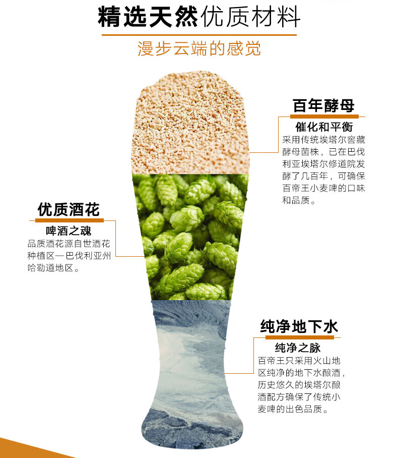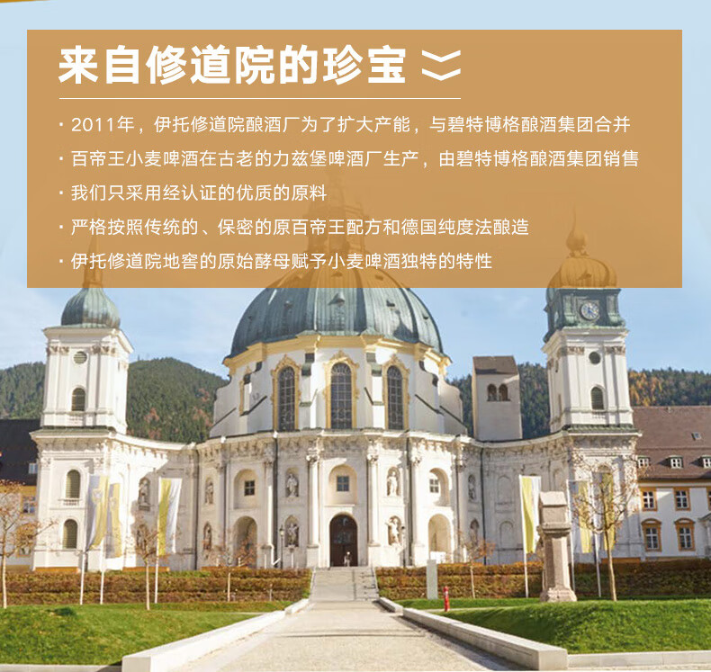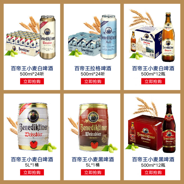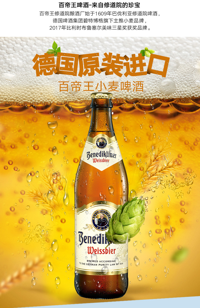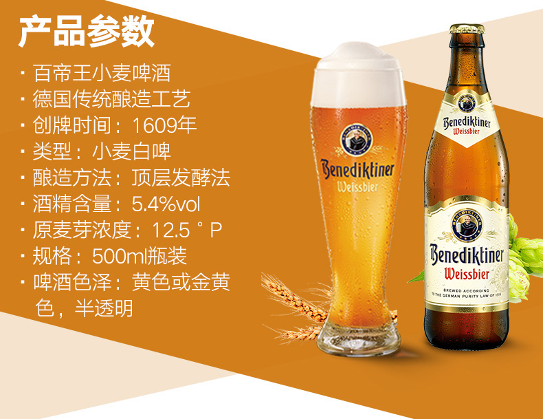 国产/进口:进口;产地:德国;适用场景:野餐出游,礼节拜访,家庭聚会,自斟自饮,情侣约会,烧烤撸串,派对必备,酒吧夜店;包装:瓶装;容量:500mL;类别:白啤酒;原料:水、小麦麦芽、大麦麦芽、啤酒花、酵母;保质期:365天;酒精度:5.4;原产地:德国;原麦汁浓度:12.5°p;存储方法:常温存放于阴凉干燥处;产品重量:6kg;容量:500ml*12;包装清单:百帝王小麦啤酒500ml*12瓶整箱装;