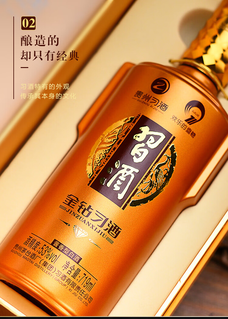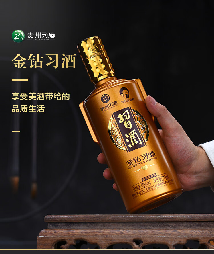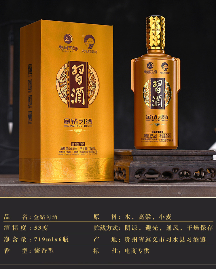 包装:整箱装;容量:500-749mL;香型:酱香型;产地:贵州;度数:50度及以上;酒精度:53%vol;容量:719;产品重量:13800g;包装清单:习酒 金质(钻石版)53度 酱香型白酒 719ml*6瓶 整箱装*1;