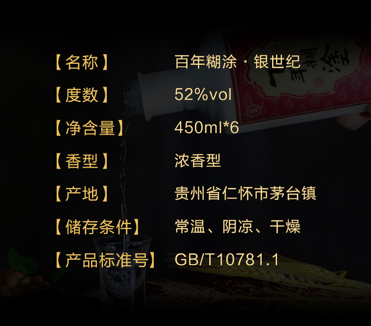 包装:整箱装;容量:376-499mL;香型:浓香型;产地:贵州;度数:50度及以上;酒精度:52%vol;容量:450ml;产品重量:8000g;包装清单:无;