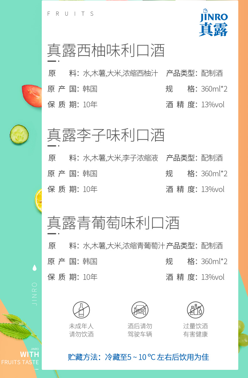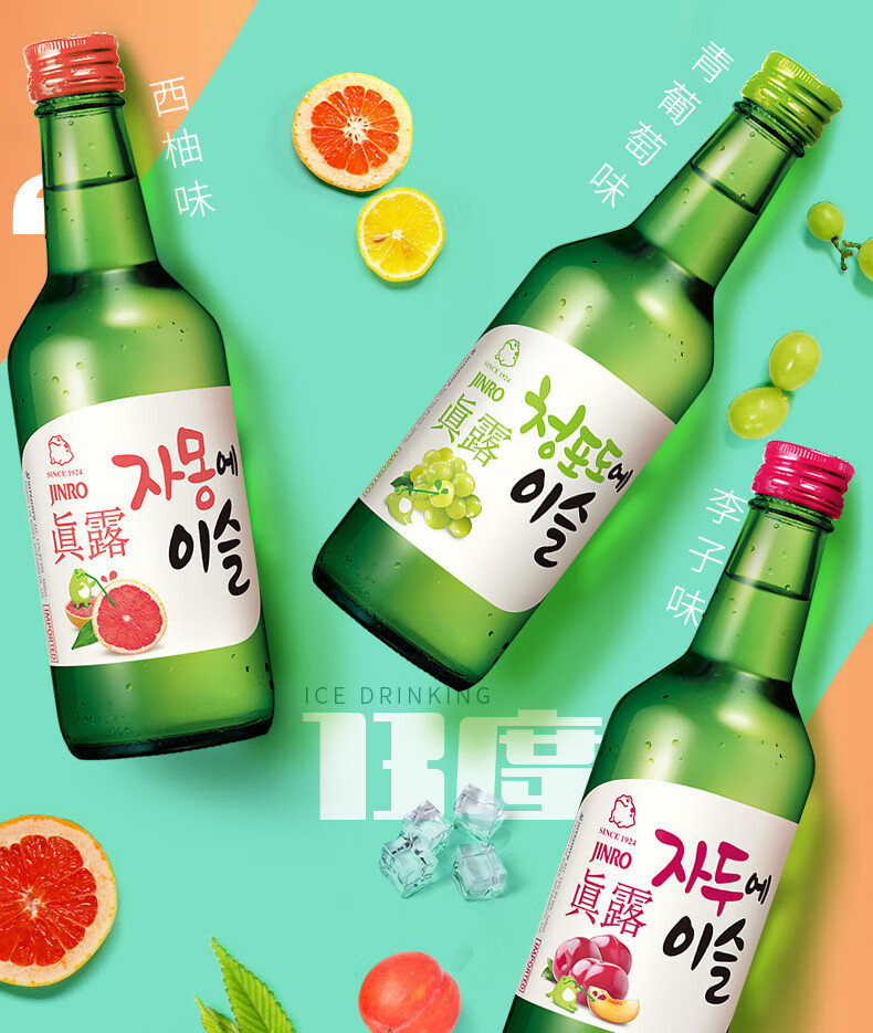 适用场景:自斟自饮,家庭聚会;包装:组合装;容量:1L及以上;国产/进口:进口;产地:韩国;原料:水、木薯、大米、浓缩果汁;保质期:3650天;酒精度:13%vol;存储方法:放置于阴凉处;产品重量:3.92kg;包装清单:真露(JINRO)烧酒13°青葡萄味360ml*2瓶+李子味360ml*2瓶+西柚味360ml*2瓶 混合装;