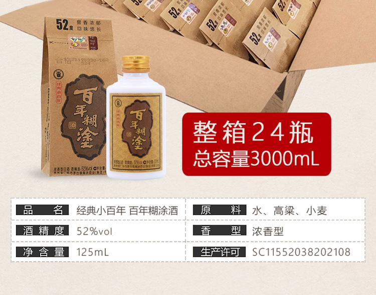 包装:整箱装;容量:375mL及以下;香型:浓香型;产地:贵州;度数:50度及以上;酒精度:52%vol;容量:125ml;产品重量:8000g;包装清单:125ml*24瓶;