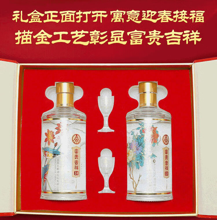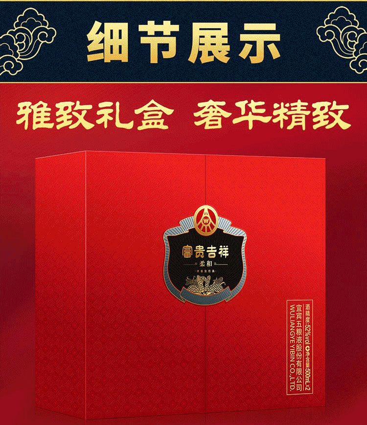 包装:礼盒装;容量:500-749mL;香型:浓香型;产地:四川;度数:50度及以上;酒精度:52%vol;容量:500;产品重量:3600g;包装清单:富贵吉祥柔和 52度500ml*2瓶 礼盒装;