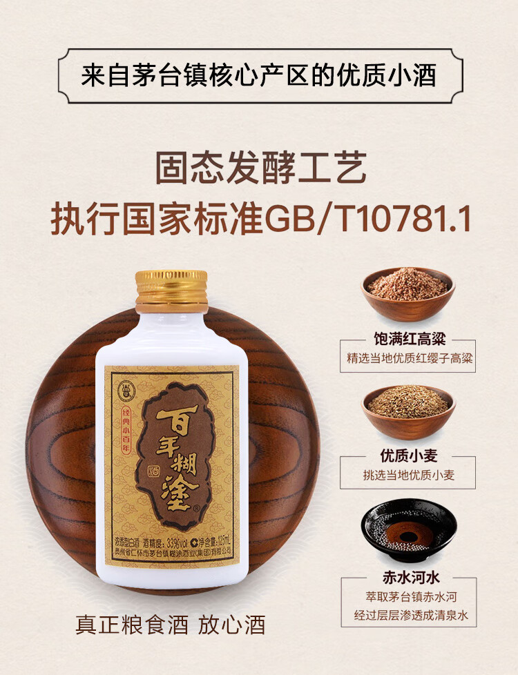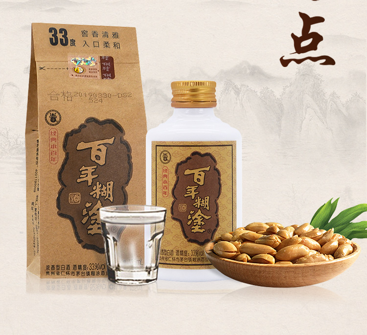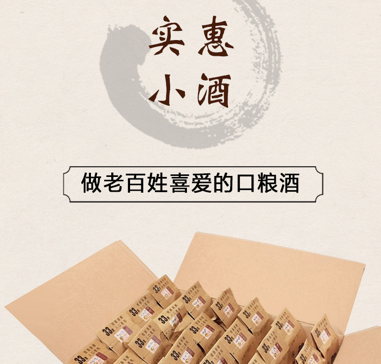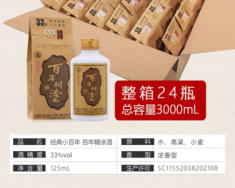 包装:整箱装;容量:375mL及以下;香型:浓香型;产地:贵州;度数:35度以下;酒精度:33%vol;容量:125ml;产品重量:8000g;包装清单:125ml*24瓶;
