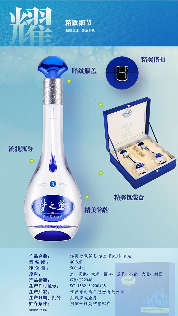 包装:礼盒装;容量:500-749mL;香型:浓香型;产地:江苏;度数:40-49度;酒精度:40.8%vol;容量:500;产品重量:0g;包装清单:洋河梦之蓝M3礼盒装 40.8度 500ml × 2瓶*1;