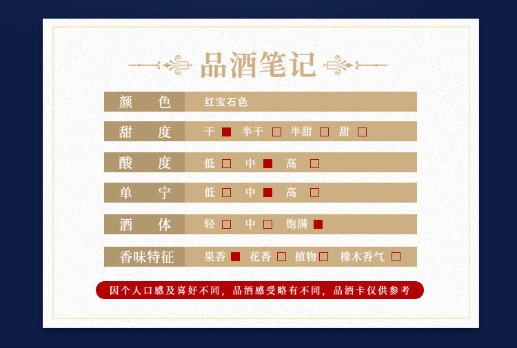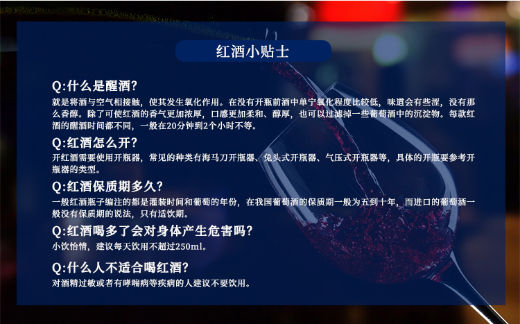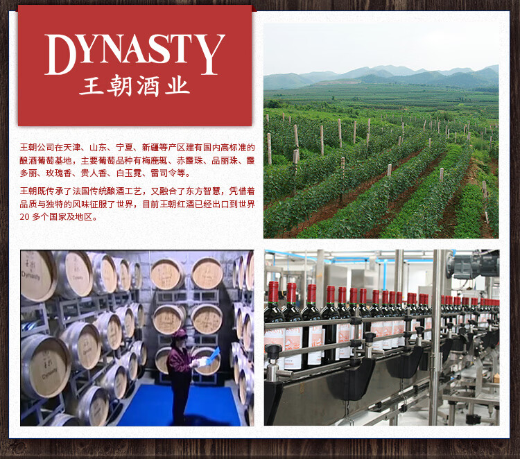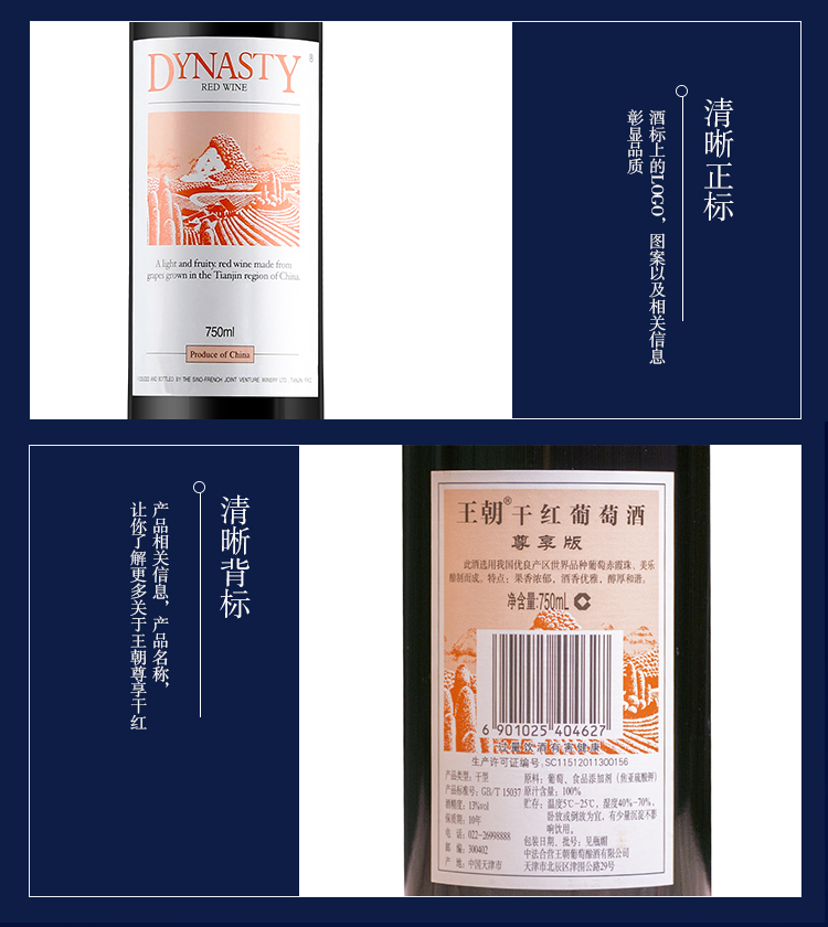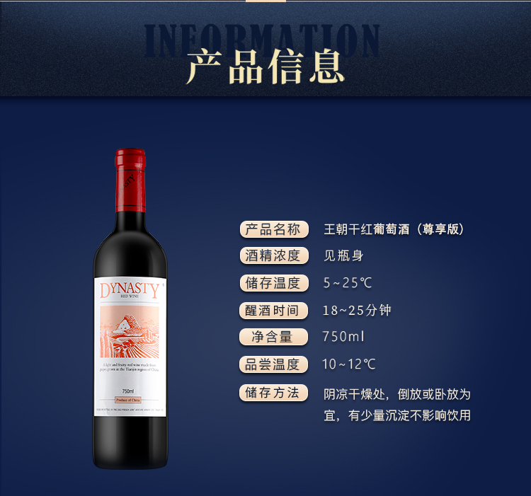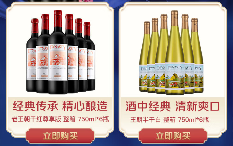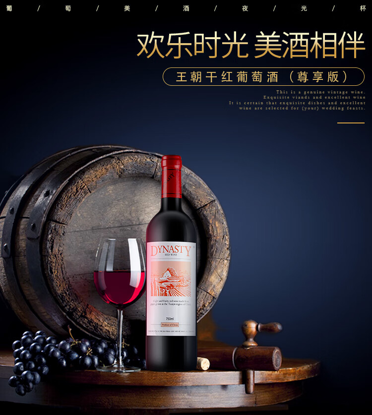 口感:饱满;特性:普通餐酒;国产/进口:国产;适用场景:礼节拜访,商务宴请,婚礼婚宴,情侣约会,家庭聚会,自斟自饮,闺蜜私语,派对活动;包装:整箱装;类别:红葡萄酒;葡萄品种:其它;产地:中国大陆;容量:750mL;甜度:干型;保质期:3650(单位:天);酒精度:12.5%vol;原产地:中国大陆;存储方法:常温、避光、卧放;容量:750ml;产品重量:7.72kg;包装清单:王朝 DYNASTY 老王朝干红葡萄酒(尊享版)750ml*6 整箱装;