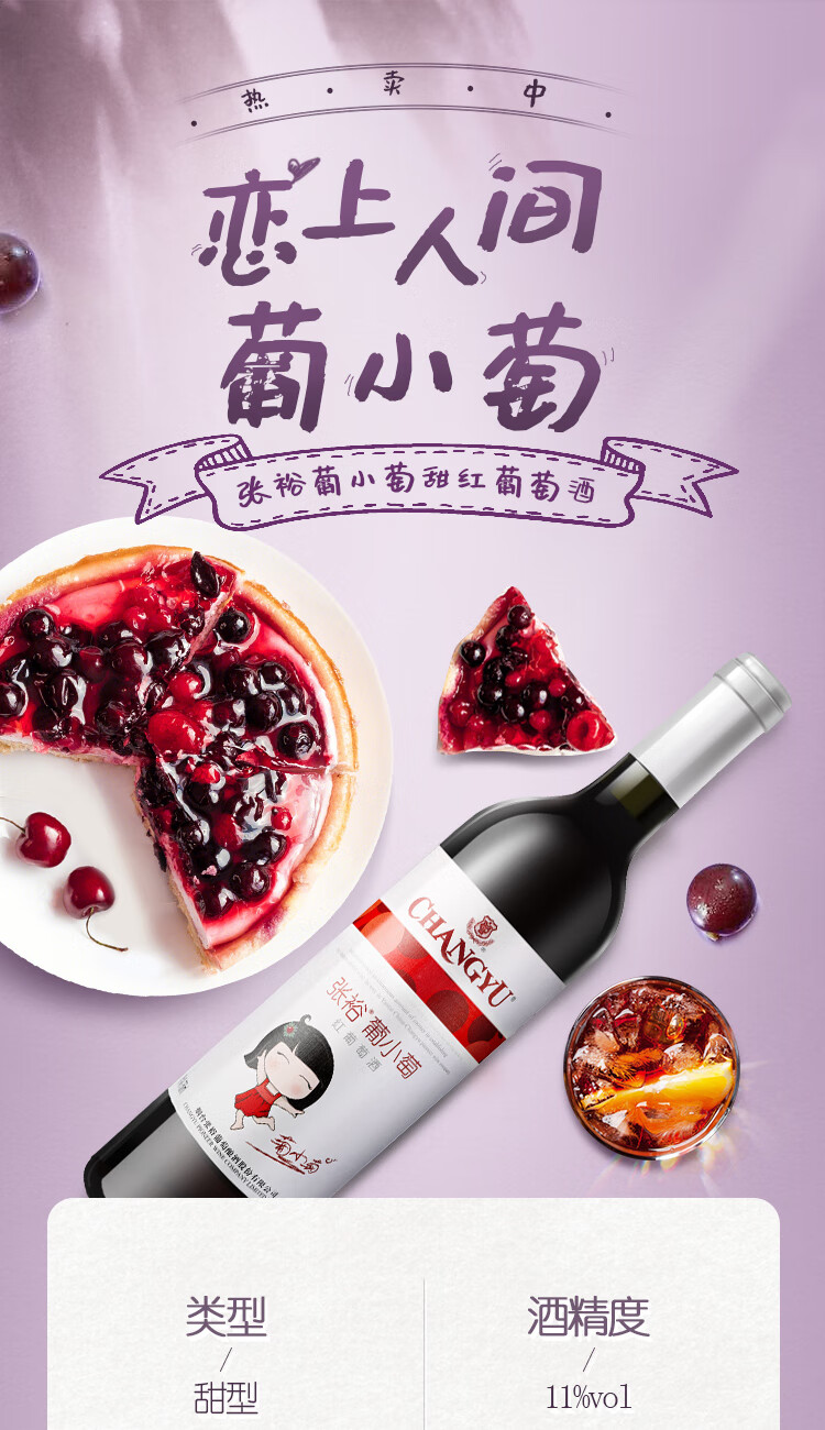 颜色:宝石红;口感:柔和;特性:普通餐酒;国产/进口:国产;适用场景:礼节拜访,商务宴请,婚礼婚宴,情侣约会,家庭聚会,自斟自饮,闺蜜私语,派对活动;包装:瓶装;酸度:低酸;类别:红葡萄酒;葡萄品种:赤霞珠(Cabernet Sauvignon);类型:静止酒;香型:花香,果香;产地:中国大陆;容量:750mL;甜度:甜型;保质期:6年;酒精度:11%vo;原产地:中国大陆;存储方法:避免阳光直射,于5℃~25℃干燥通风处卧放或倒放,有少量沉淀不影响饮用;容量:750ml;产品重量:1.27kg;包装清单:葡小萄甜红葡萄酒 750ml*1;