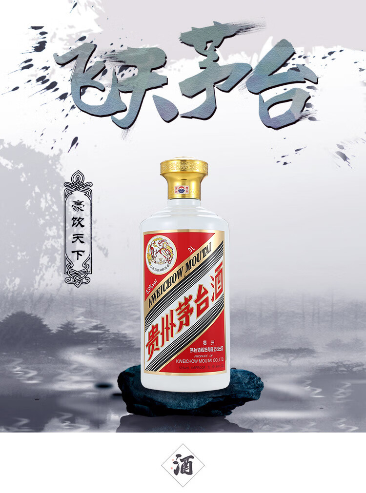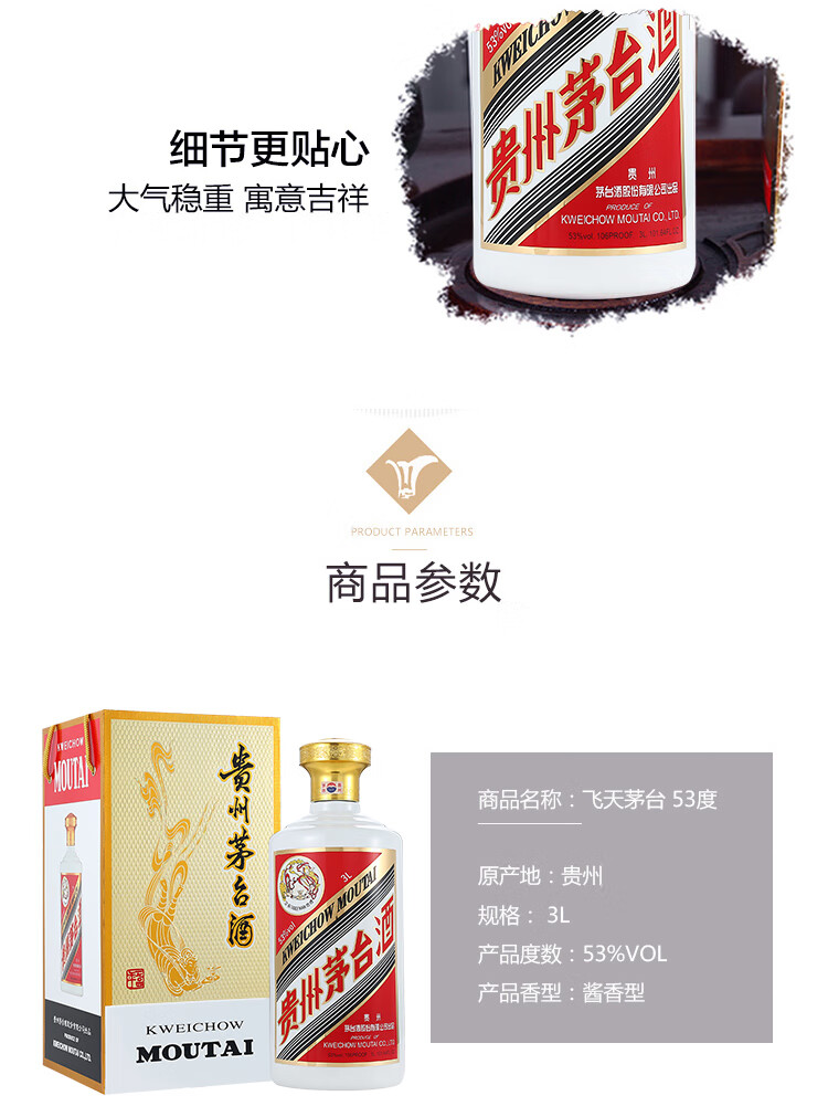 包装:瓶装;容量:750mL及以上;香型:酱香型;产地:贵州;度数:50度及以上;酒精度:53%vol;容量:3L;产品重量:3000g;包装清单:茅台 飞天 53度 单瓶装白酒 3L 口感酱香型*1;