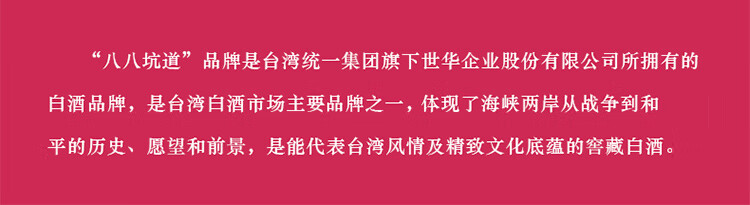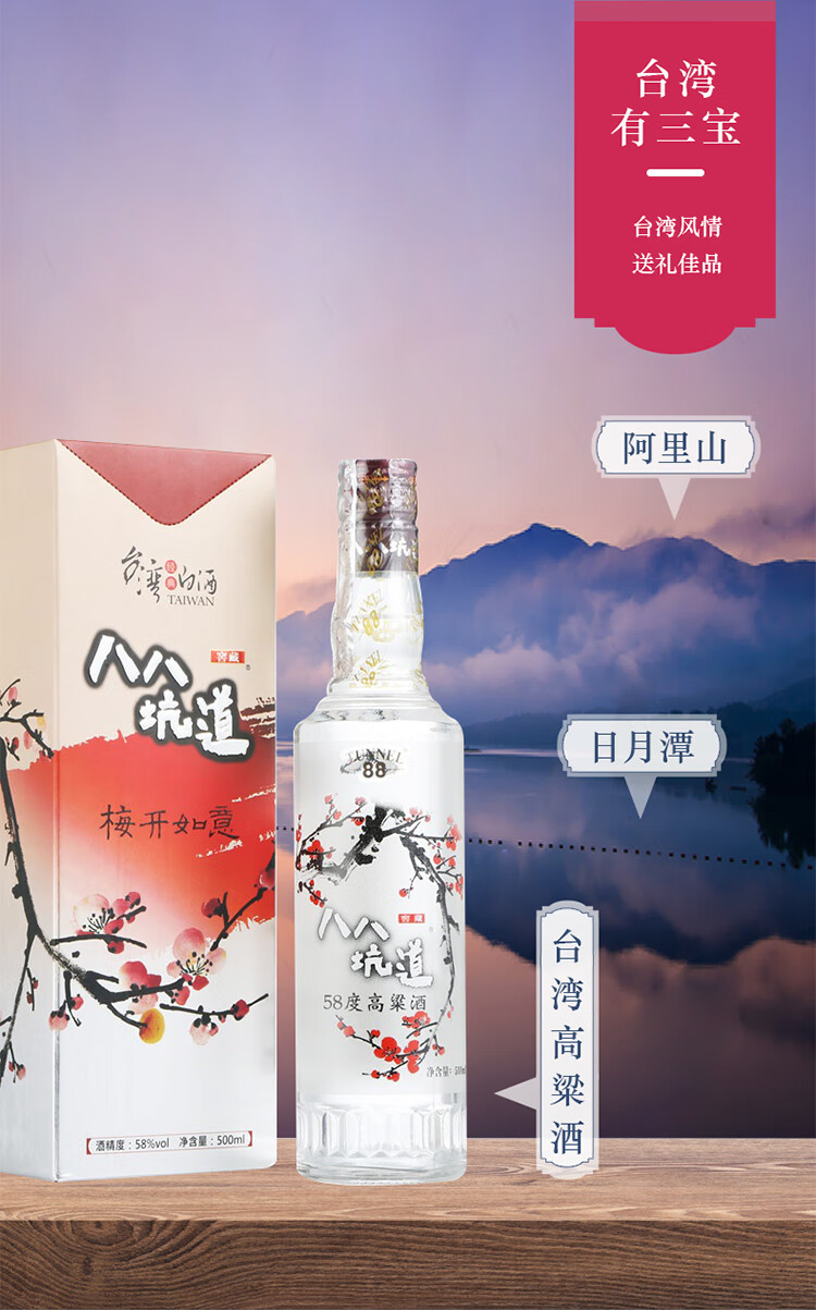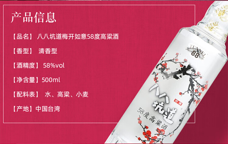 包装:整箱装;容量:376-499mL;香型:清香型;产地:中国台湾;度数:50度及以上;酒精度:58%vol;容量:500;产品重量:500g;包装清单:八八坑道白酒 清香型 梅开如意 58度 500ml*4 整箱装 【箱内礼品袋两个】;
