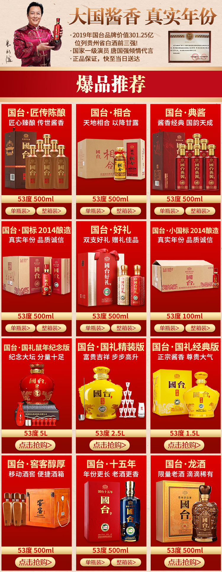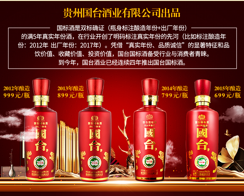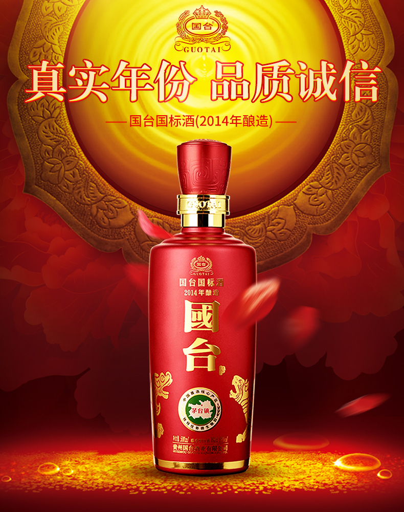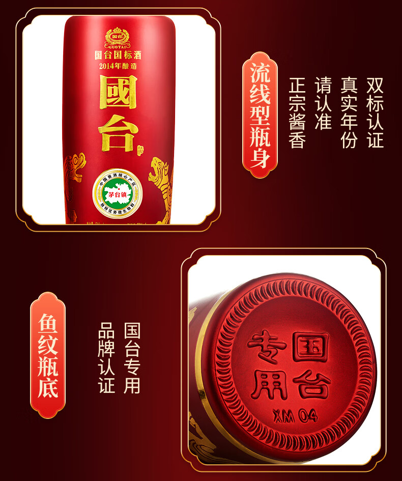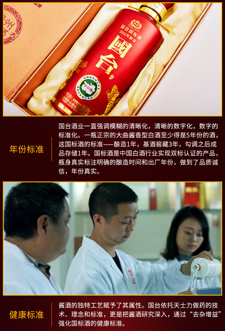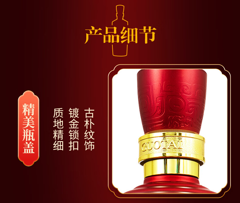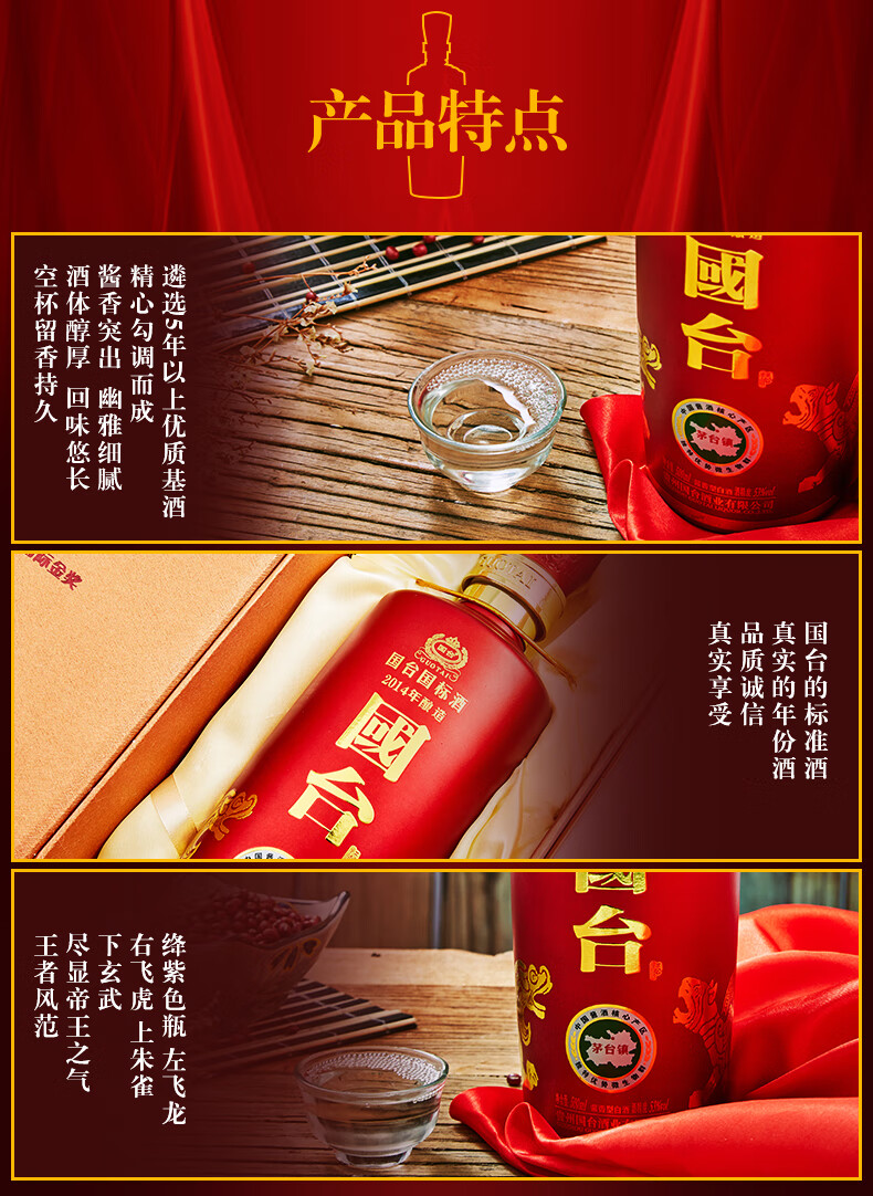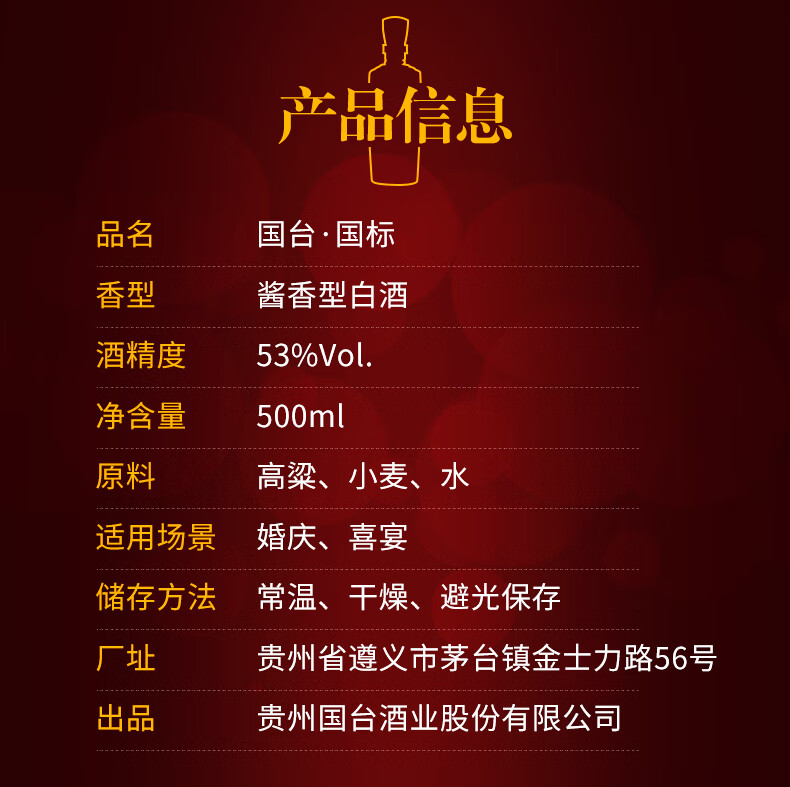 包装:瓶装;容量:500-749mL;香型:酱香型;产地:贵州;度数:50度及以上;酒精度:53%vol;容量:500ml;产品重量:1800g;包装清单:国台 国标酒 53度 500ml单瓶装;