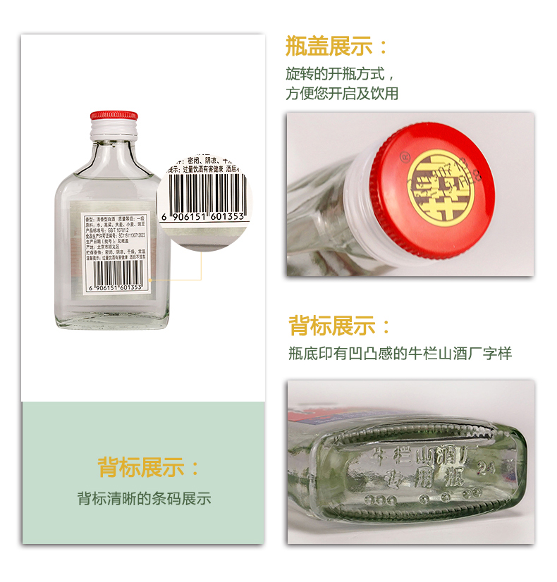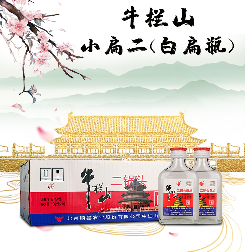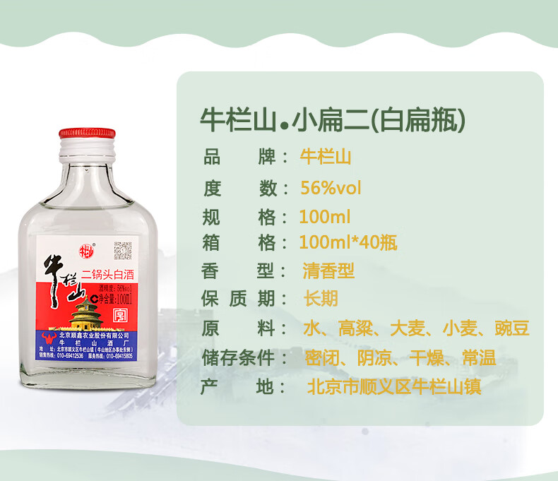 包装:整箱装;容量:375mL及以下;香型:清香型;度数:50度及以上;香型:清香型;产地:北京;酒精度:56%vol;包装:整箱装;产品重量:10500g;容量:100ml;包装清单:牛栏山 白酒 清香型 二锅头 白瓶 小扁二(扁瓶)56度 100ml*40瓶 整箱装;