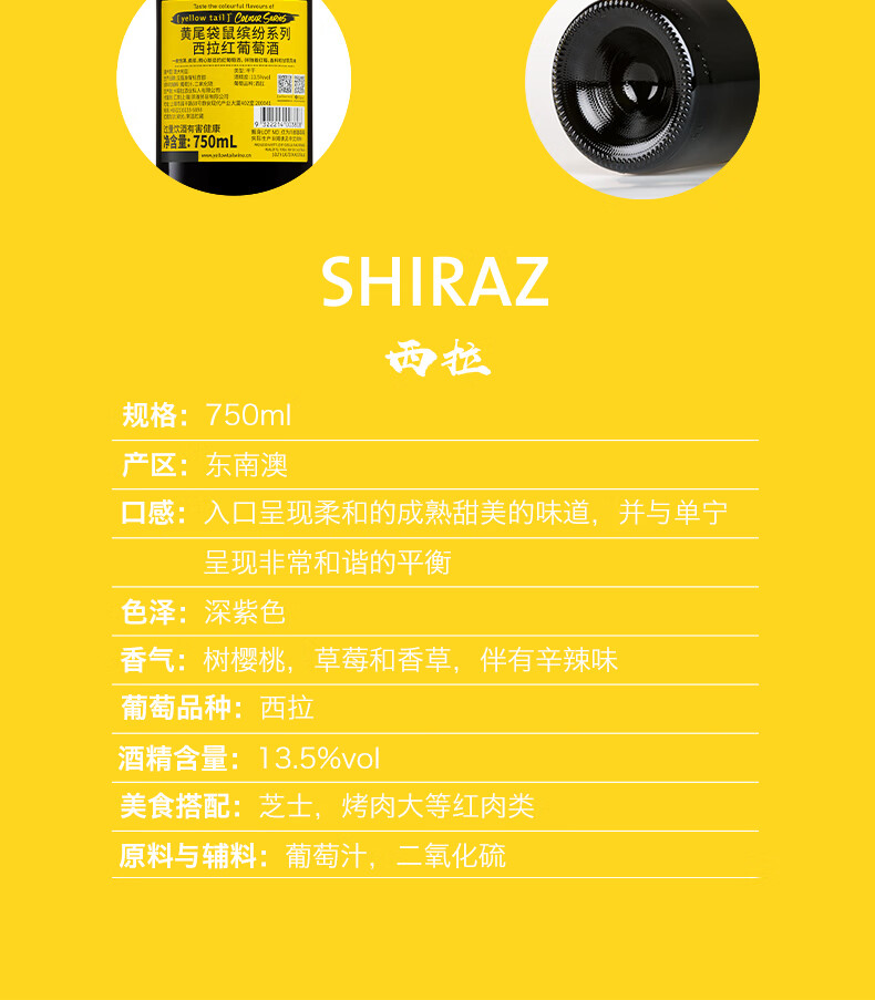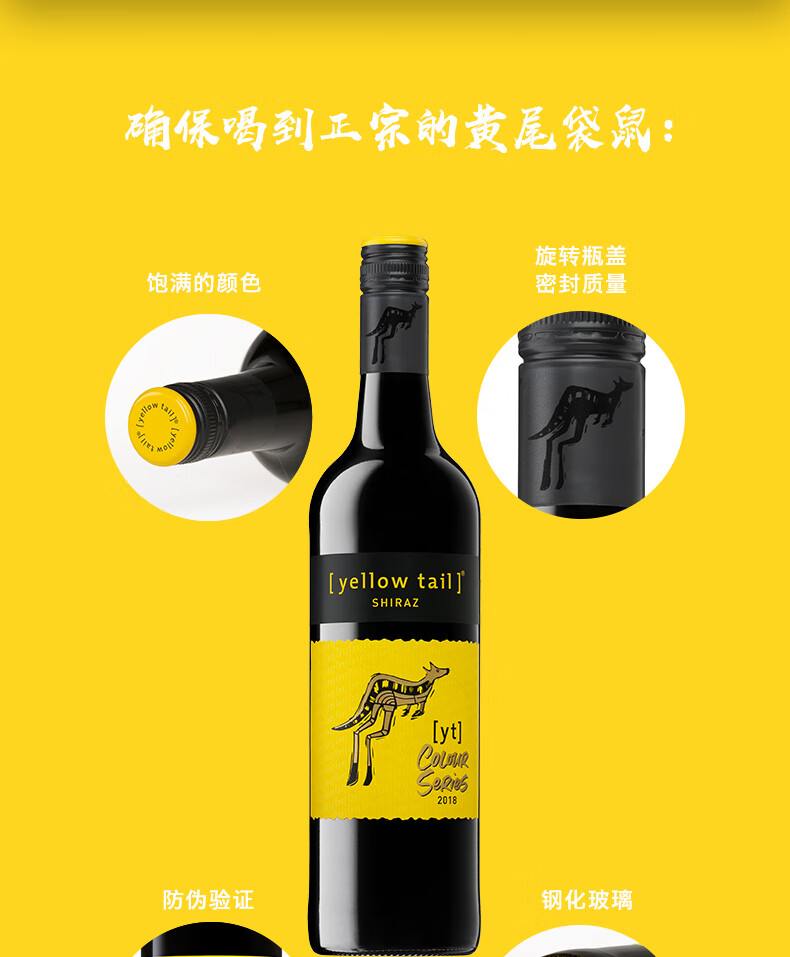 类型:静止酒;口感:柔和;特性:普通餐酒;国产/进口:进口;产地:澳大利亚;适用场景:礼节拜访,情侣约会,家庭聚会,闺蜜私语,派对活动;包装:瓶装;容量:750mL;甜度:半干型;类别:红葡萄酒;葡萄品种:西拉/设拉子(Syrah/Shiraz);系列:缤纷系列;保质期:见瓶身背标底部;酒精度:13.5%vol;原产地:澳大利亚;存储方法:避光、常温贮藏;容量:750ml;产品重量:1.17kg;包装清单:黄尾袋鼠 缤纷系列西拉葡萄酒750ml*1瓶;