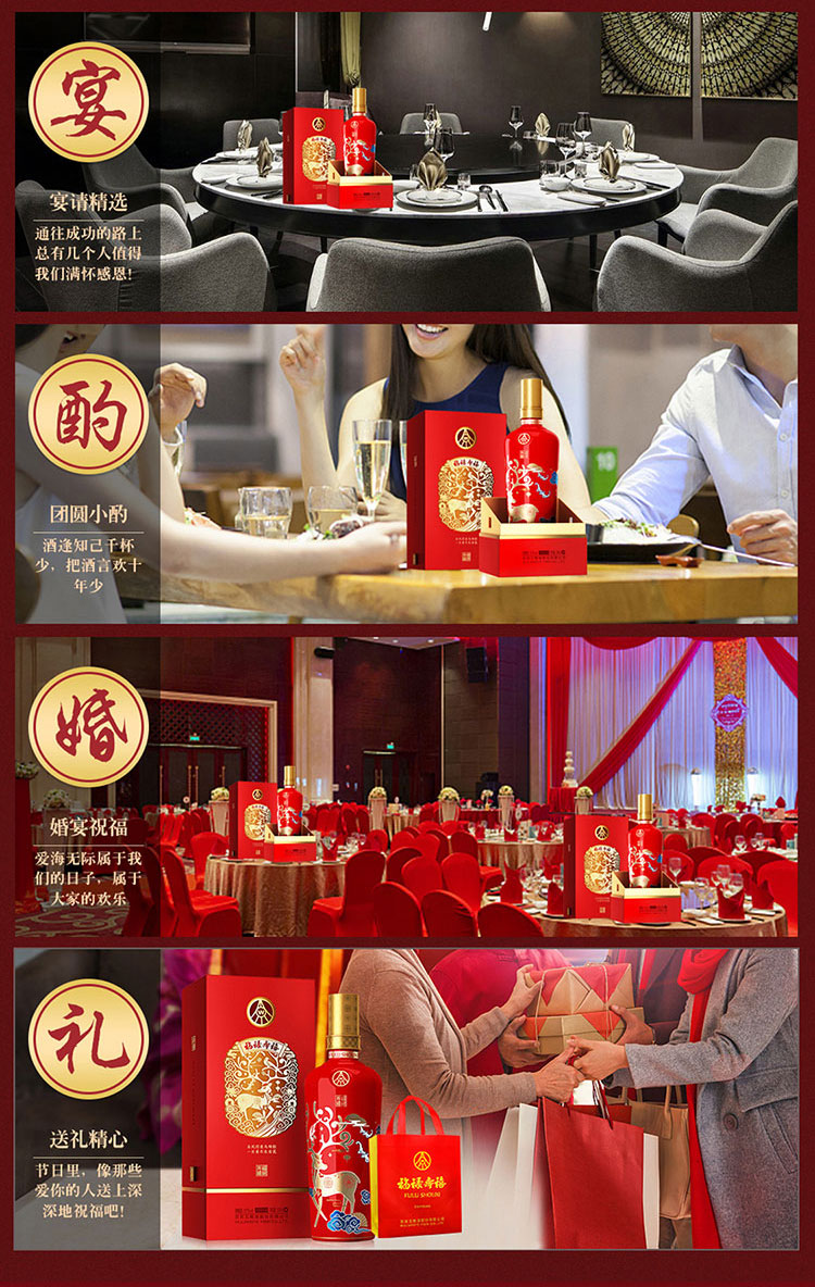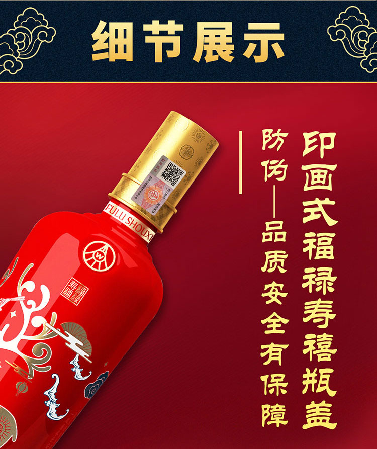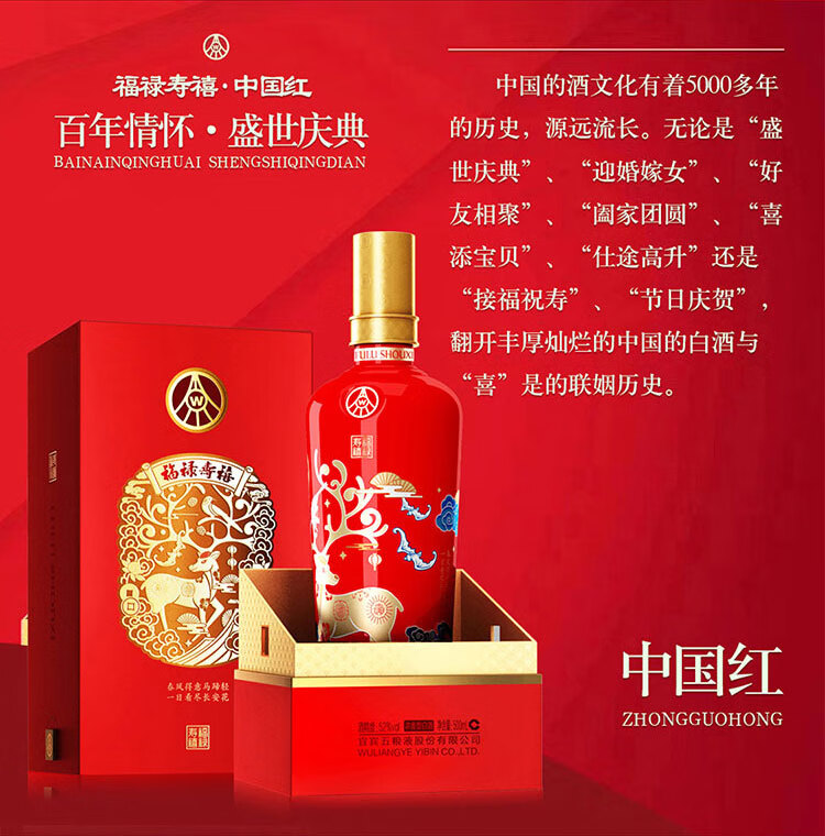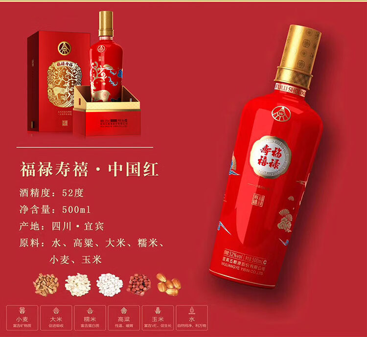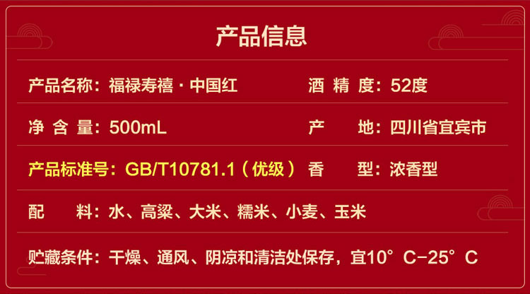 包装:瓶装;容量:500-749mL;香型:浓香型;产地:四川;度数:50度及以上;酒精度:52%vol;容量:500;产品重量:1500g;包装清单:福禄寿禧中国红 52度500mL;