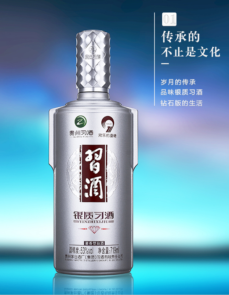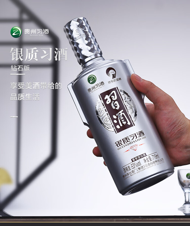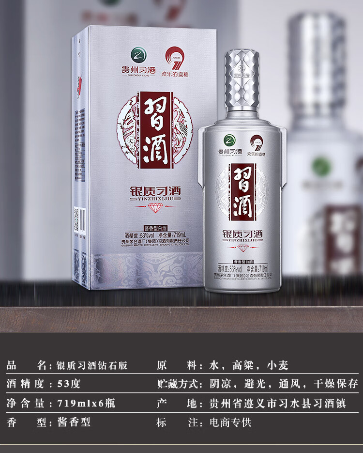 包装:整箱装;容量:500-749mL;香型:酱香型;产地:贵州;度数:50度及以上;酒精度:53%vol;容量:719;产品重量:13800g;包装清单:习酒 银质(钻石版)53度 酱香型白酒 719ml*6瓶 整箱装 *1;
