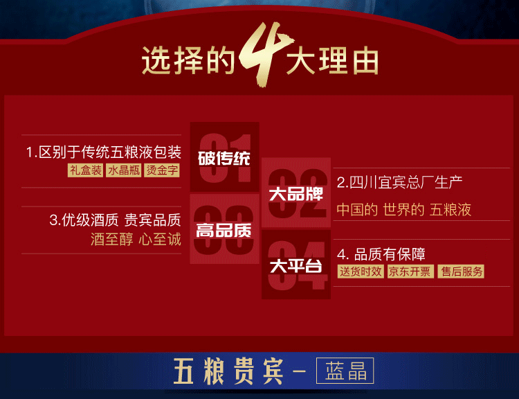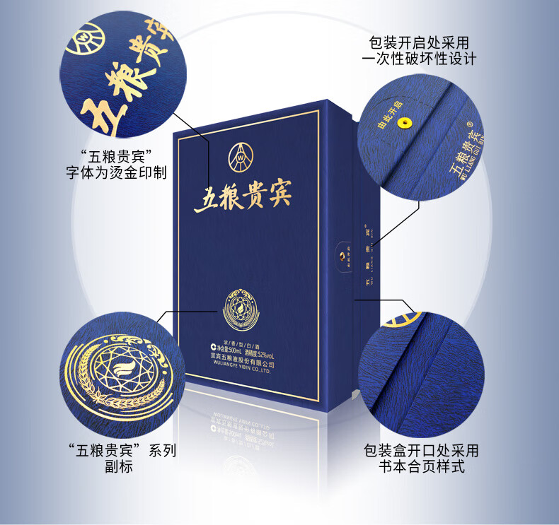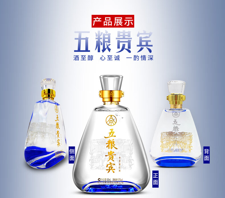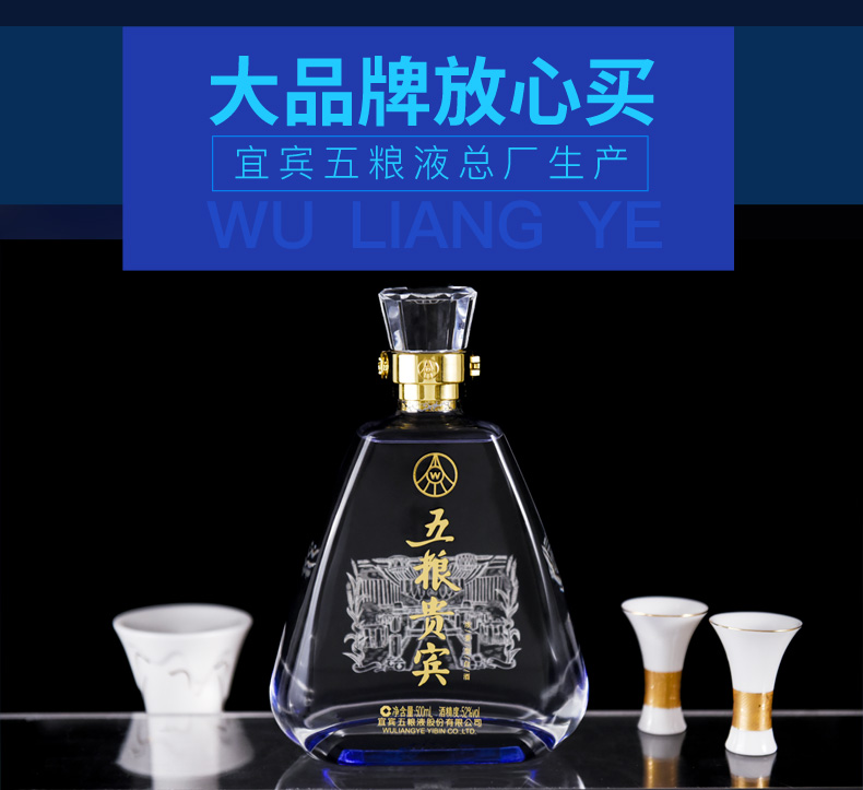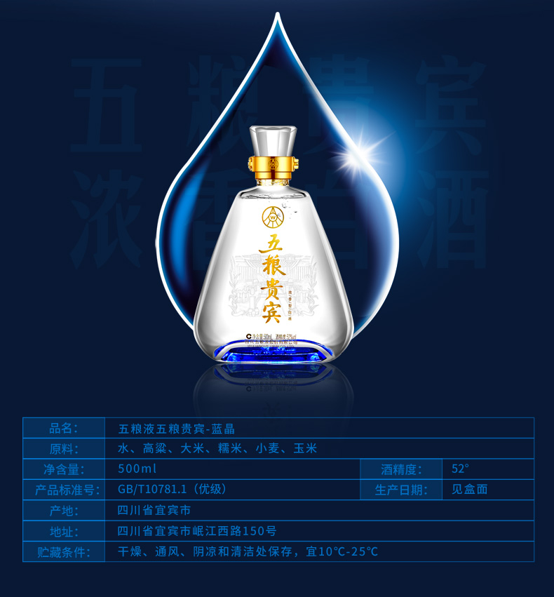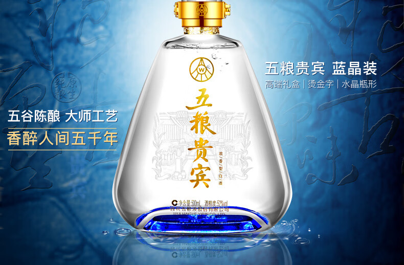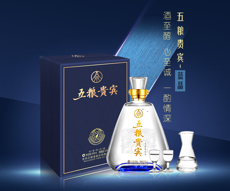 包装:礼盒装;容量:500-749mL;香型:浓香型;产地:四川;度数:50度及以上;酒精度:52%vol;容量:500ml;产品重量:1700g;包装清单:五粮液股份 白酒 浓香型 五粮贵宾蓝晶 52度 500ml*1 礼盒装;