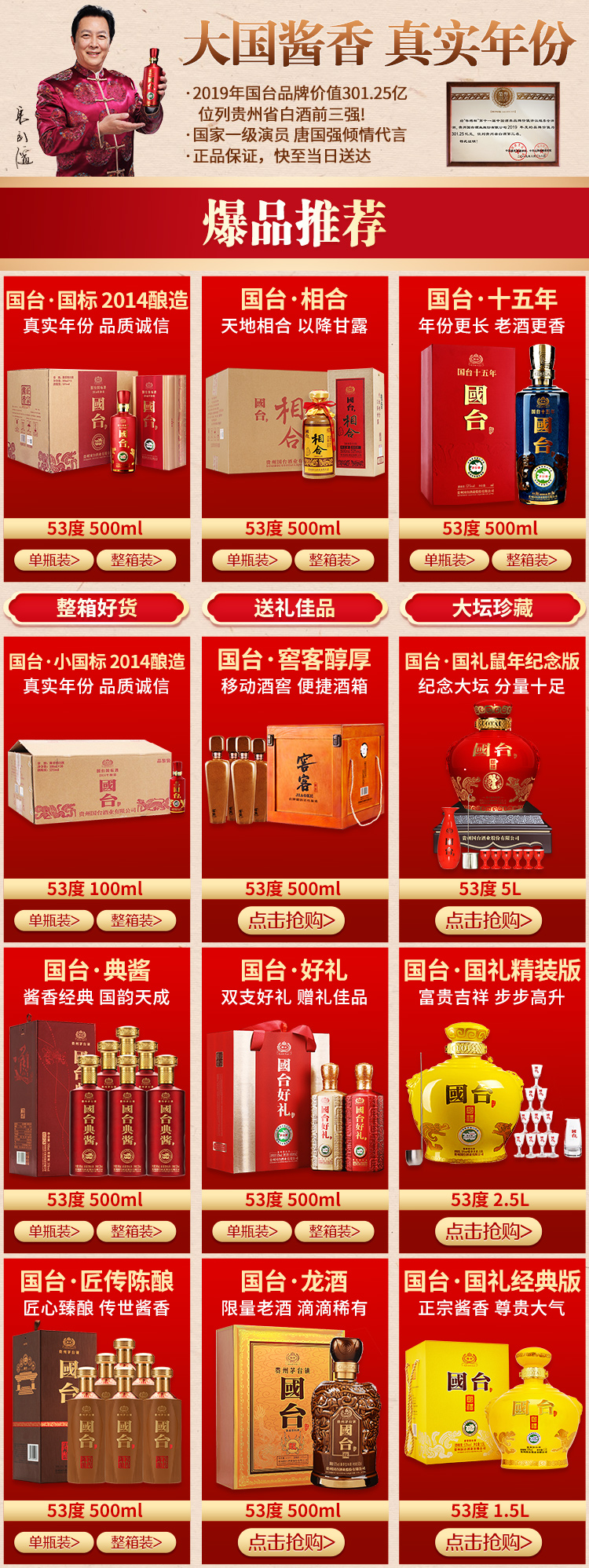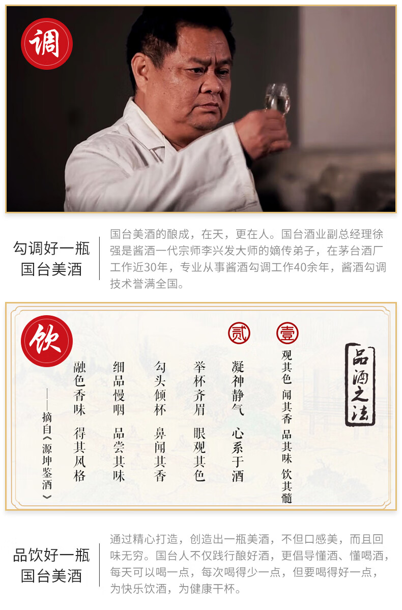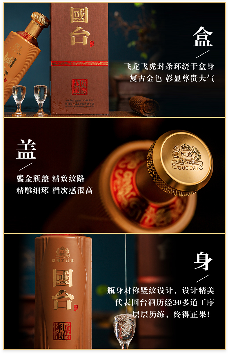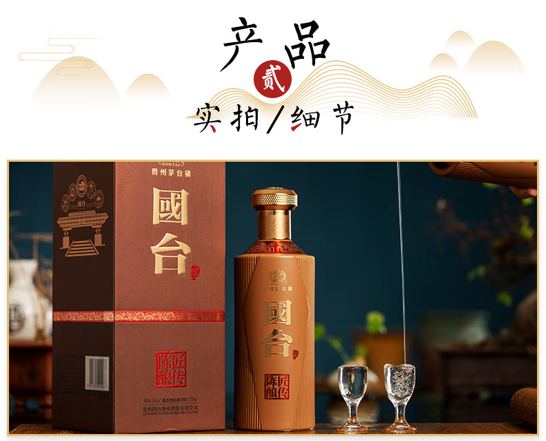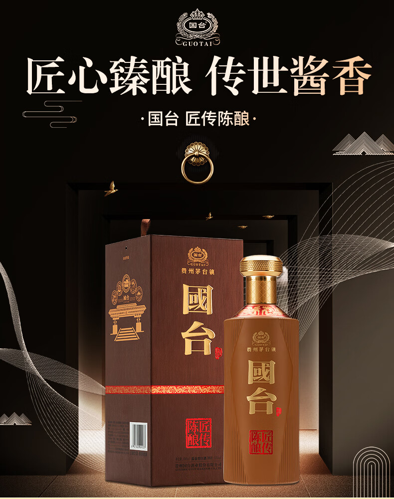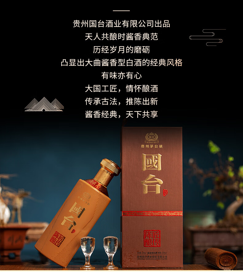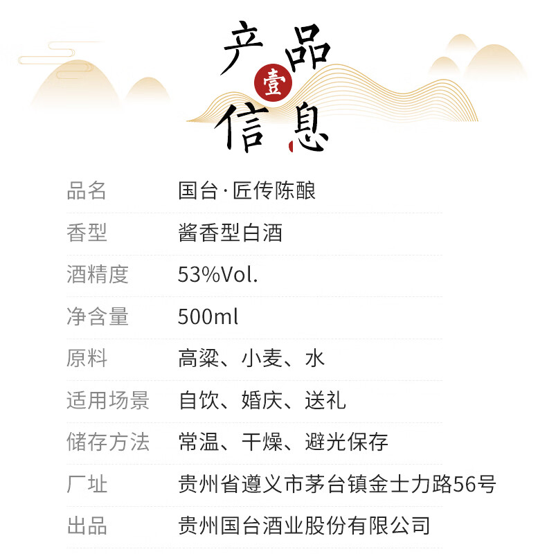包装:瓶装;容量:500-749mL;香型:酱香型;产地:贵州;度数:50度及以上;酒精度:53%vol;容量:500ml;产品重量:1500g;包装清单:国台 匠传陈酿酒 53度 500ml单瓶装;