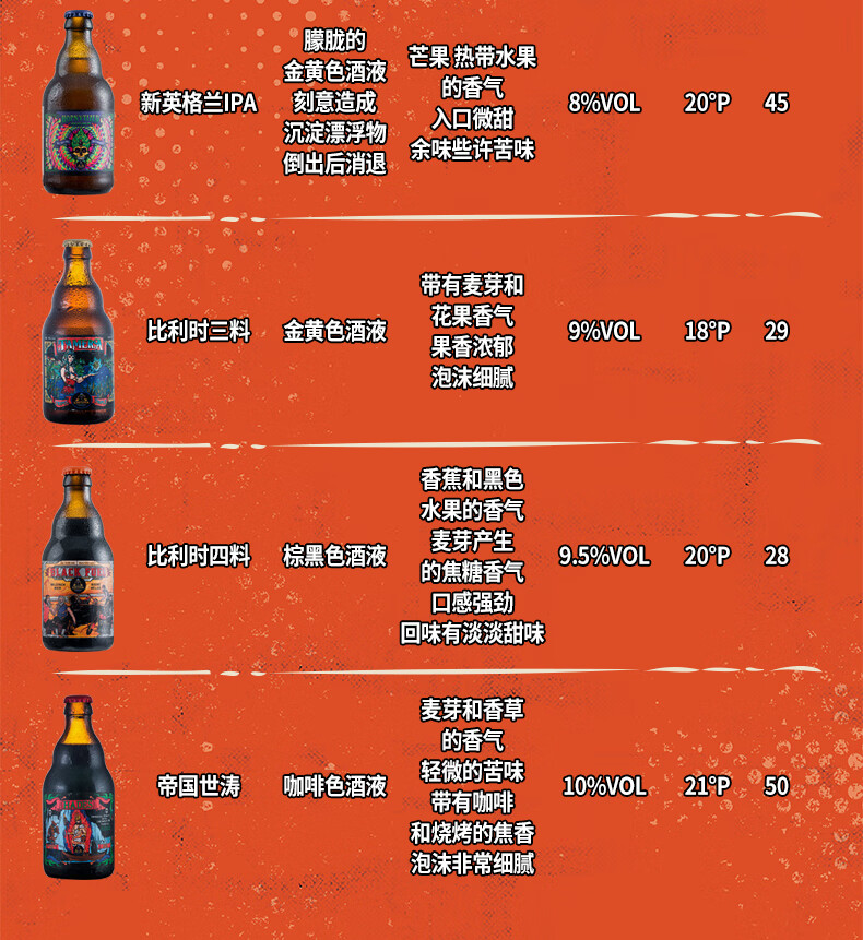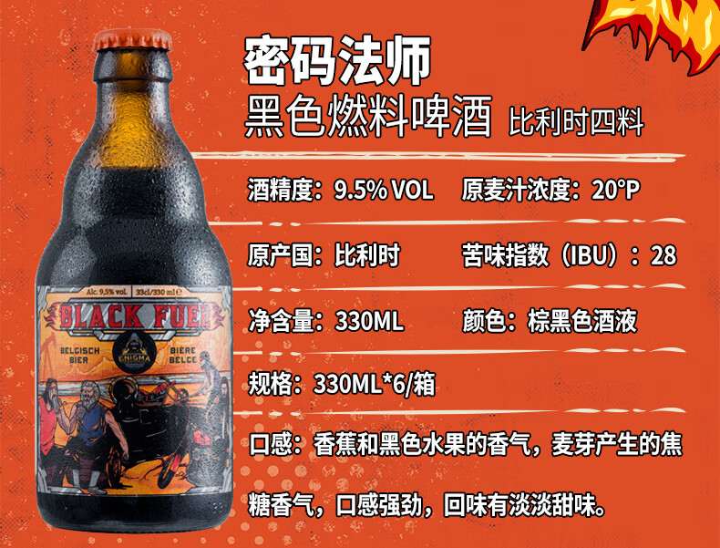 国产/进口:进口;产地:比利时;适用场景:家庭聚会,情侣约会,自斟自饮,派对必备,烧烤撸串,酒吧夜店,野餐出游;包装:瓶装;容量:330mL;类别:精酿;原料:水、大麦麦芽、食用香料、酵母、啤酒花;国产/进口:进口;保质期:3年;酒精度:9.5%Vol;原产地:比利时;原麦汁浓度:20°P;存储方法:室温阴凉干燥处;类别:精酿;包装:瓶装;产品重量:3.86kg;容量:330ml*6;包装清单:密码法师黑色燃料啤酒 330ml*6瓶 整箱装;