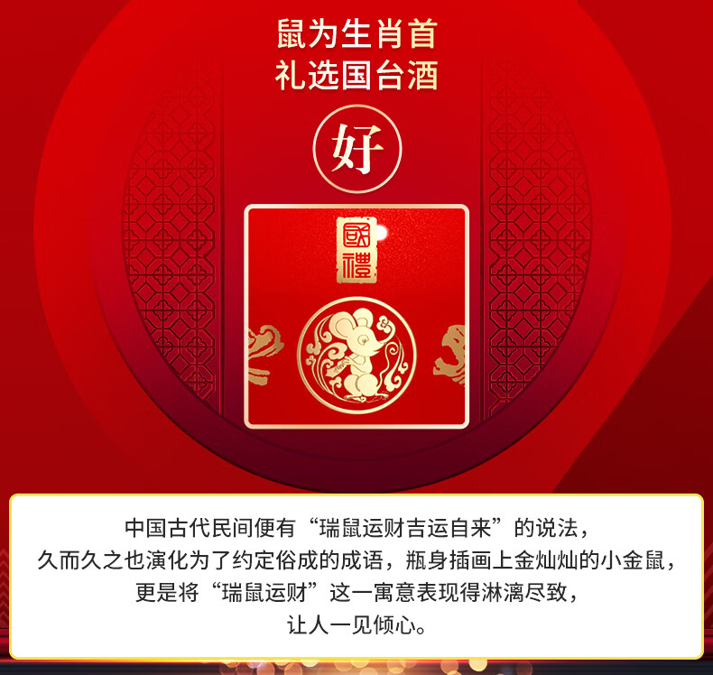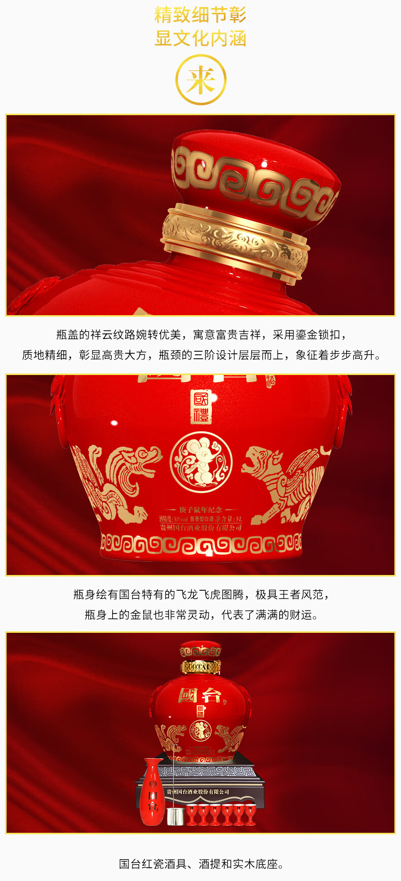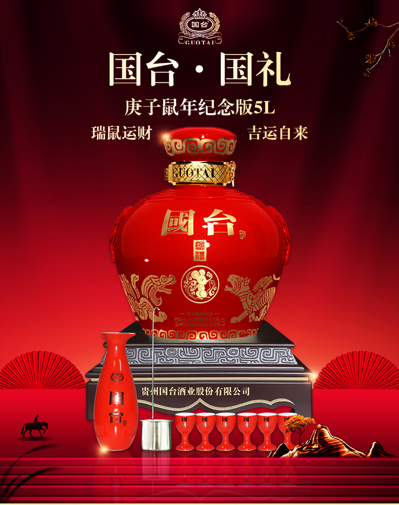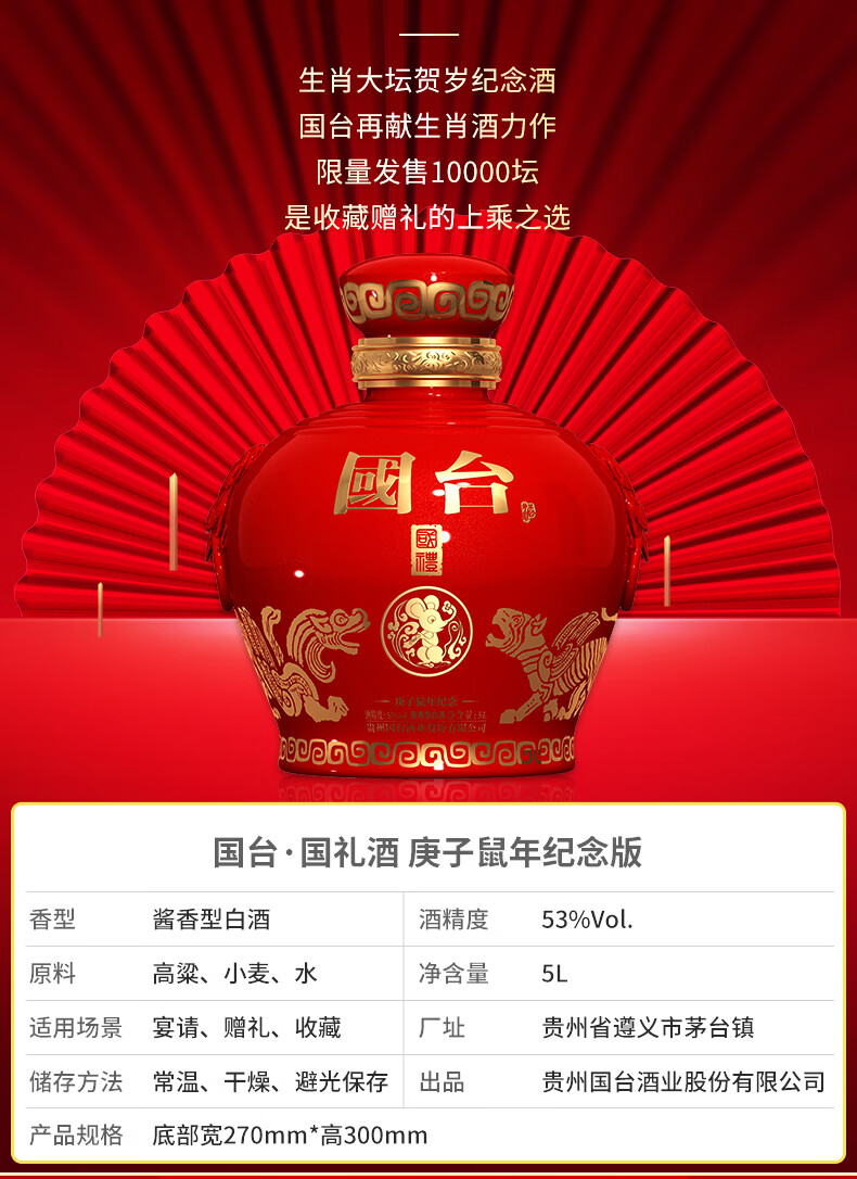 包装:整箱装;容量:750mL及以上;香型:酱香型;产地:贵州;度数:50度及以上;酒精度:53%vol;容量:5000ml;产品重量:8000g;包装清单:国台 国礼酒庚子鼠年纪念版5L;