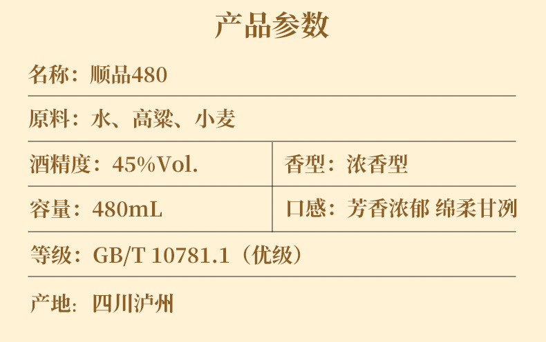包装:整箱装;容量:376-499mL;香型:浓香型;产地:四川;度数:40-49度;酒精度:45%vol;容量:500ml *6;产品重量:10000g;包装清单:480ml*12;