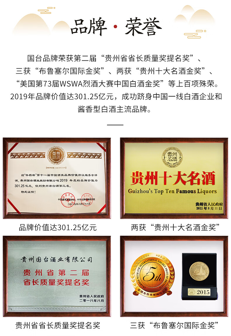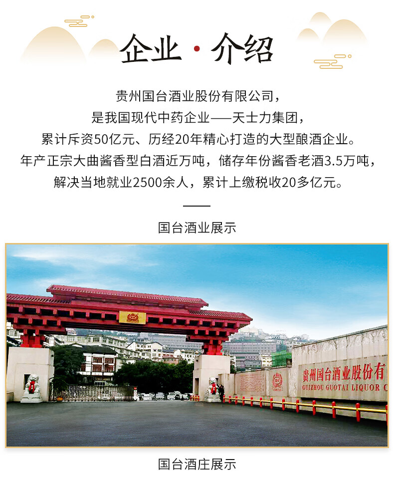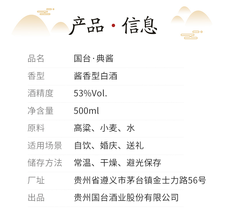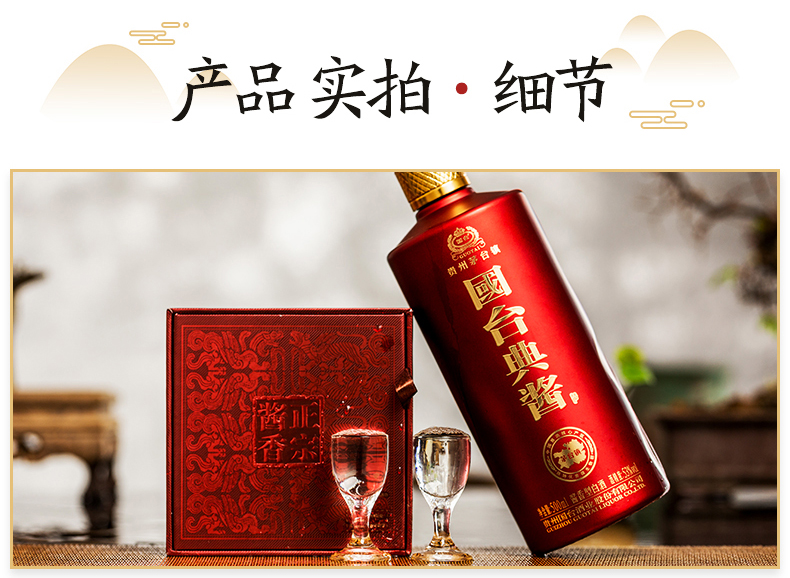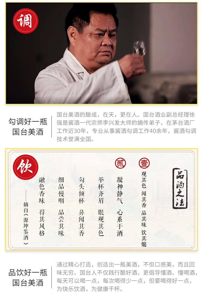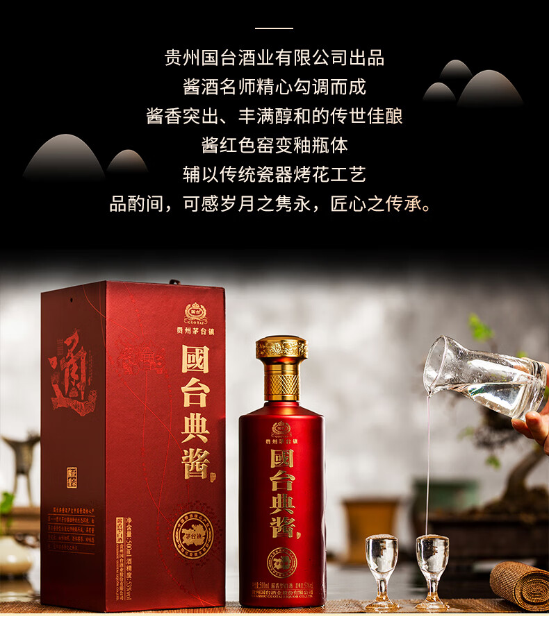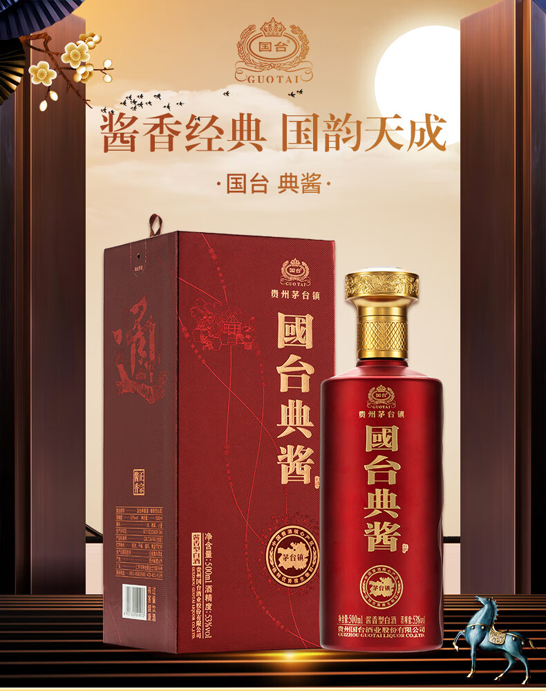 包装:整箱装;容量:500-749mL;香型:酱香型;产地:贵州;度数:50度及以上;酒精度:53%vol;容量:500ml;产品重量:9000g;包装清单:国台 典酱酒 53度 500ml*6瓶整箱装;