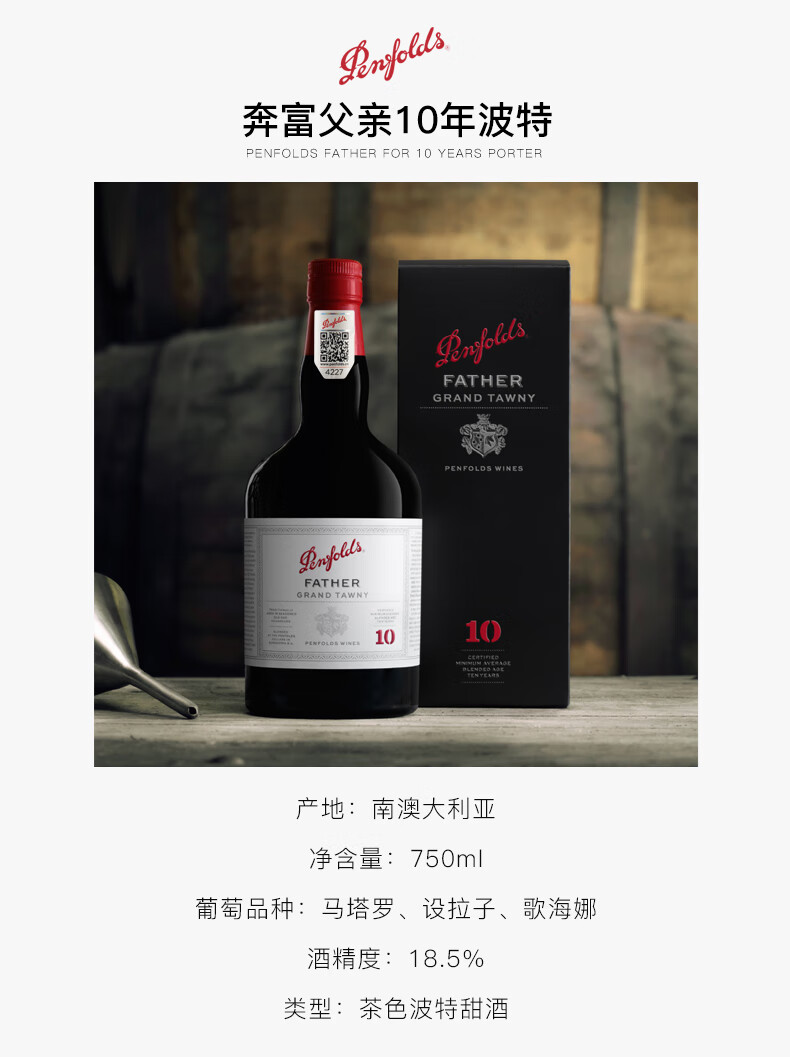 口感:香甜;特性:精品葡萄酒,名庄葡萄酒,普通餐酒;国产/进口:进口;适用场景:礼节拜访,商务宴请,婚礼婚宴,情侣约会,家庭聚会,收藏,自斟自饮,闺蜜私语,派对活动;包装:瓶装;类别:红葡萄酒;葡萄品种:混合(Blending);类型:加强型葡萄酒;香型:其它;产地:澳大利亚;容量:750mL;甜度:甜型;保质期:无;酒精度:18.5%vol;原产地:澳大利亚;存储方法:常温、避光、卧放;容量:750ml;产品重量:1.2kg;包装清单:奔富父亲10年750ml*1瓶;