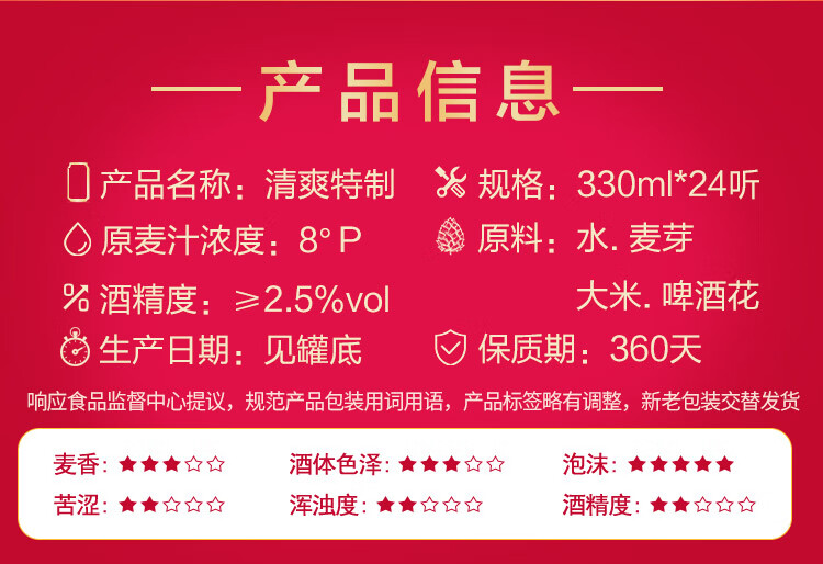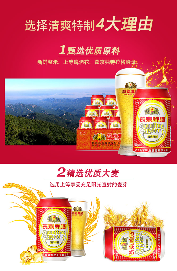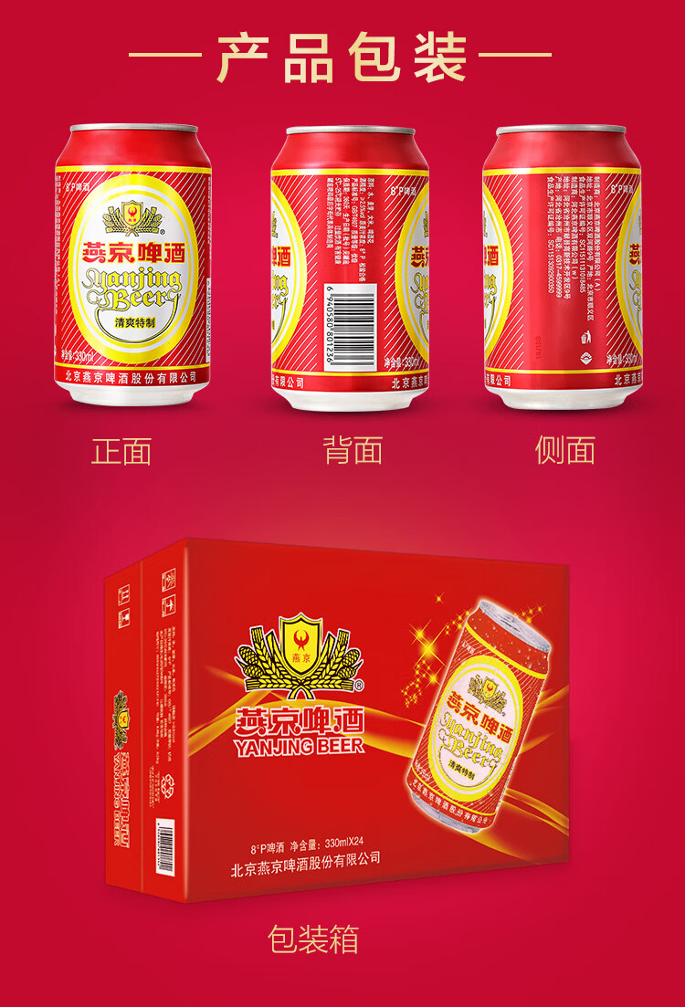 国产/进口:国产;产地:中国大陆;适用场景:野餐出游,礼节拜访,家庭聚会,自斟自饮,情侣约会,烧烤撸串,派对必备,酒吧夜店;包装:听装;容量:330mL;类别:黄啤酒;原料:水,麦芽,大米,啤酒花;保质期:360天;酒精度:≥2.5%vol;原产地:中国大陆;原麦汁浓度:8°P;存储方法:5℃-25℃, 避光贮运;容量:330ml;产品重量:8.6kg;包装清单:燕京啤酒 8度 清爽特质啤酒330ml*24听整箱装 红罐;