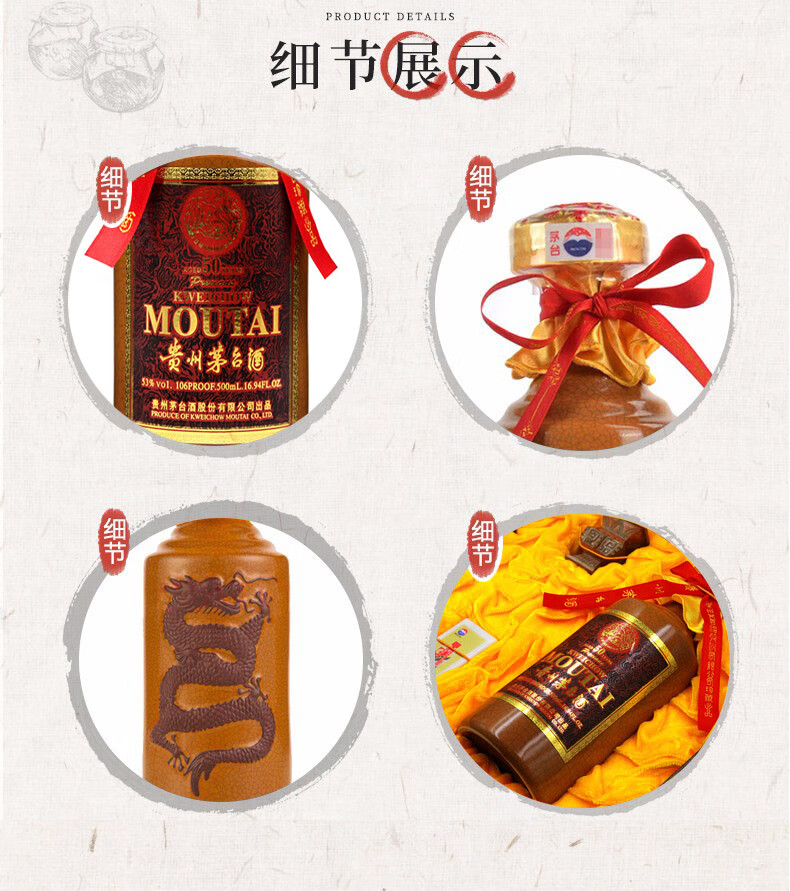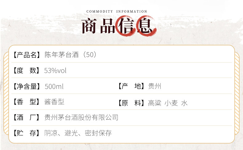 包装:礼盒装;容量:500-749mL;香型:酱香型;产地:贵州;度数:50度及以上;酒精度:53%vol;容量:500ml;产品重量:870g;包装清单:茅台 53%vol 500ml陈年贵州茅台酒(50);