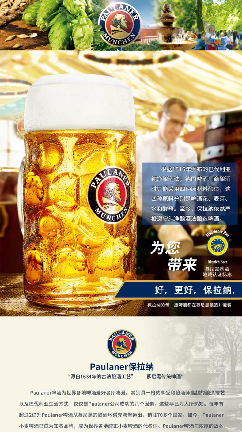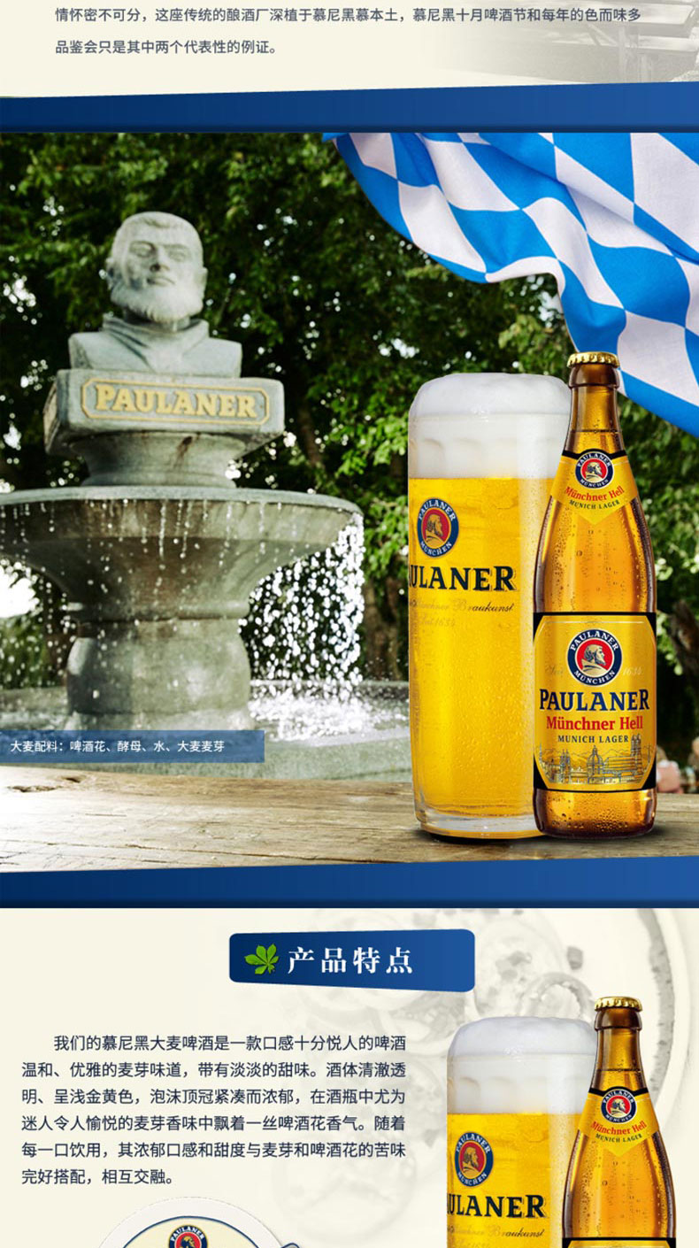 国产/进口:进口;产地:德国;适用场景:家庭聚会,自斟自饮,烧烤撸串,派对必备;包装:瓶装;容量:500mL;类别:其它;原料:水、麦芽、啤酒花;系列:酵母性大麦;保质期:365天;酒精度:4.9%vol;原产地:德国;原麦汁浓度:11.5°P;存储方法:常温避光保存;产品重量:16.13kg;容量:500ml;包装清单:保拉纳/柏龙(PAULANER)慕尼黑大麦啤酒500ml*20瓶装 整箱装 德国进口*1;
