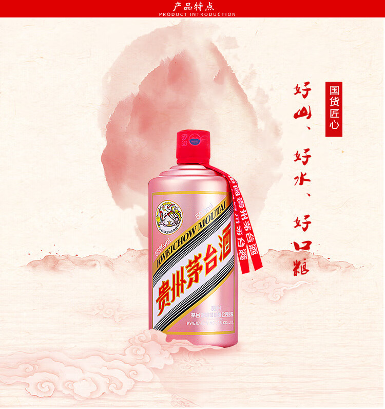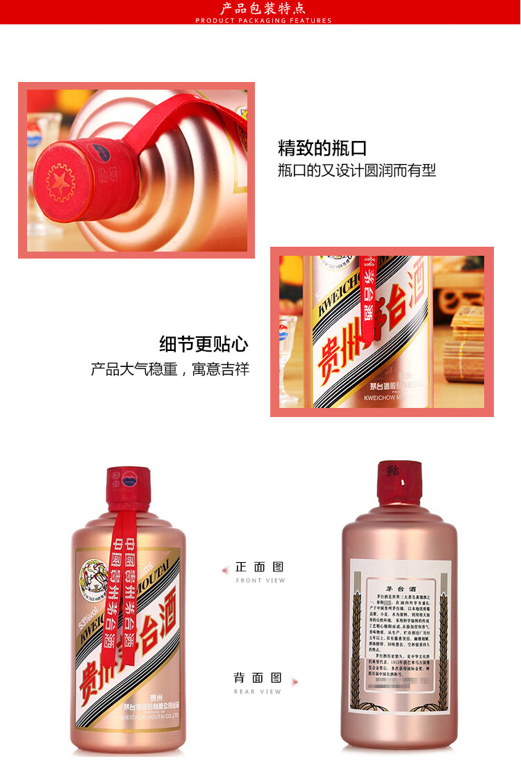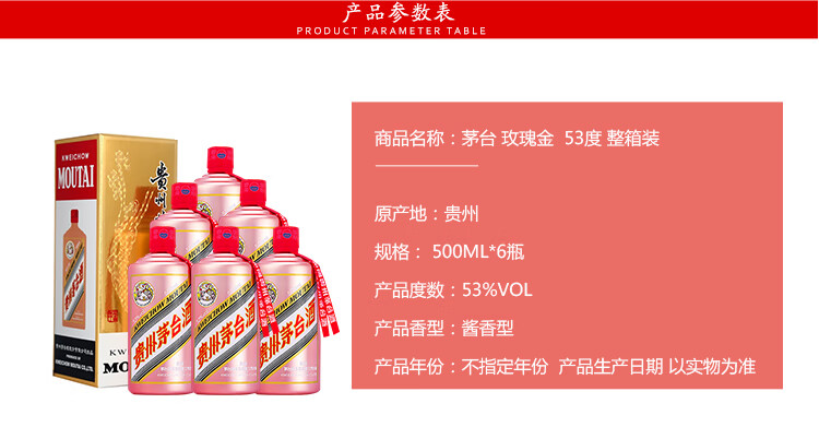 包装:整箱装;容量:500-749mL;香型:酱香型;产地:贵州;度数:50度及以上;酒精度:53%vol;容量:500ml;产品重量:3000g;包装清单:茅台 玫瑰金 53度 500ml*6瓶 整箱装 酱香型白酒*1;