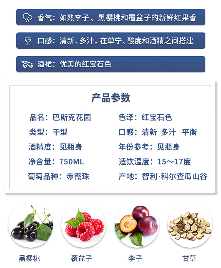 颜色:宝石红;口感:柔和;特性:其它;国产/进口:进口;适用场景:礼节拜访,商务宴请,婚礼婚宴,家庭聚会,收藏,自斟自饮;包装:整箱装;酸度:中酸;类别:红葡萄酒;葡萄品种:赤霞珠(Cabernet Sauvignon);类型:静止酒;香型:香料,木香,烘烤,花香,植物,果香;产地:智利;容量:750mL;甜度:干型;保质期:10年;酒精度:14%vol;原产地:智利;存储方法:平放或倒置于阴凉避光处;容量:750ml*6;产品重量:9.06kg;包装清单:巴斯克花园红葡萄酒750ml*6,木箱*1,海马刀*1;