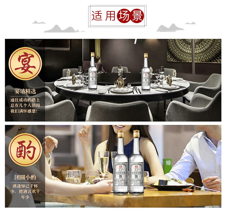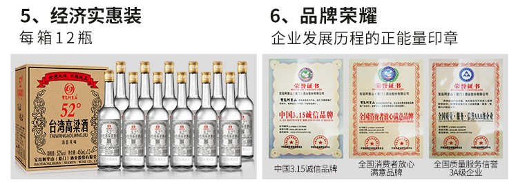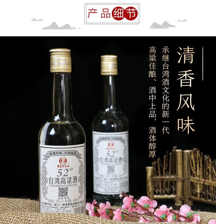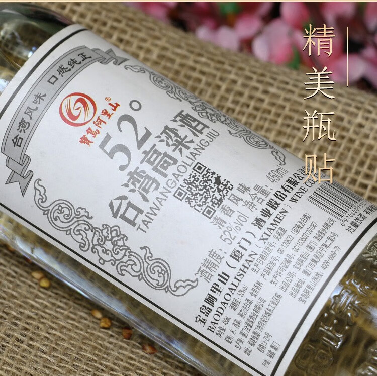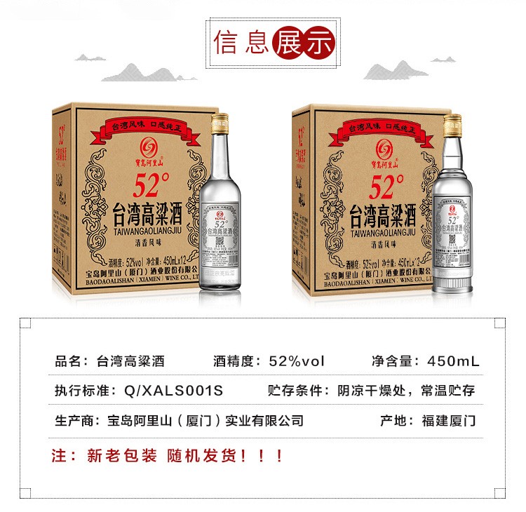 包装:整箱装;容量:376-499mL;香型:其它;产地:福建;度数:50度及以上;酒精度:52%vol;容量:450ml;产品重量:845g;包装清单:宝岛阿里山台湾高粱酒 52度白酒 450ml*12瓶整箱装(新老包装随机发货);