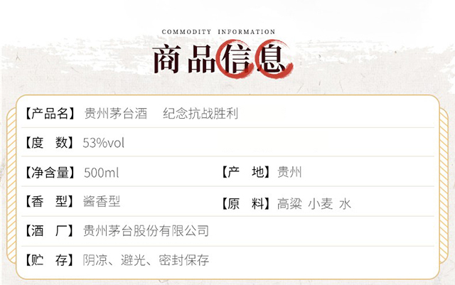 包装:瓶装;容量:500-749mL;香型:酱香型;产地:贵州;度数:50度及以上;酒精度:53%vol;容量:500ml;产品重量:870g;包装清单:茅台 抗战胜利纪念 酱香型白酒 53度 500ml单瓶装*1;
