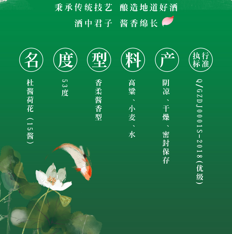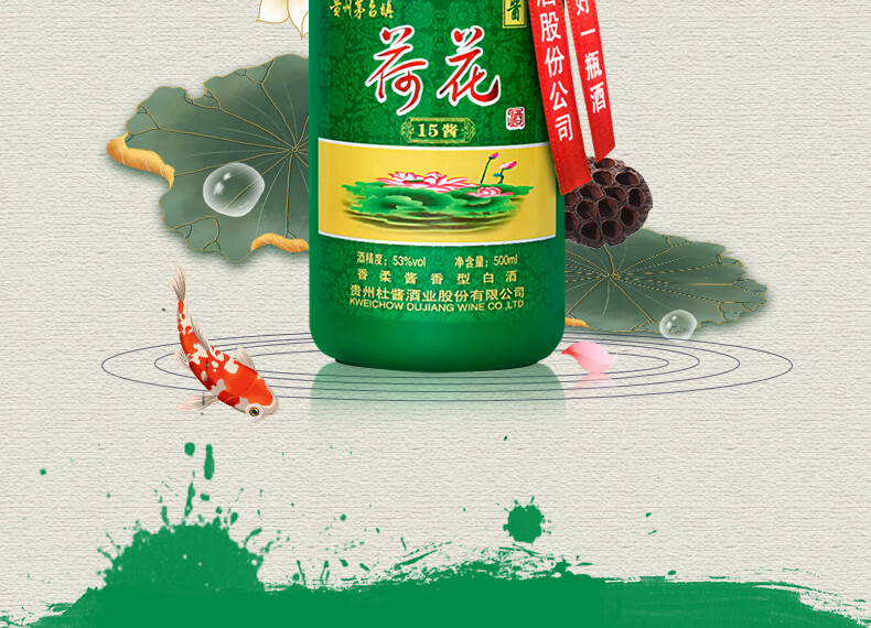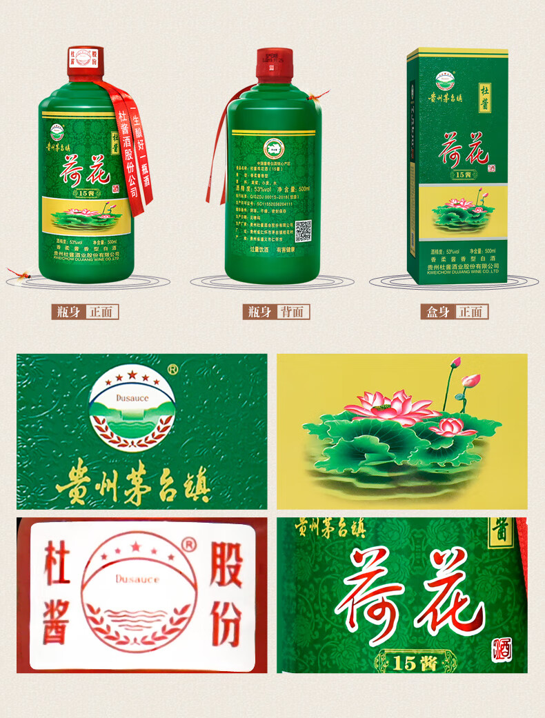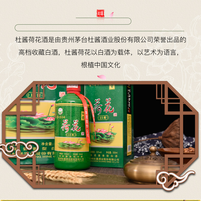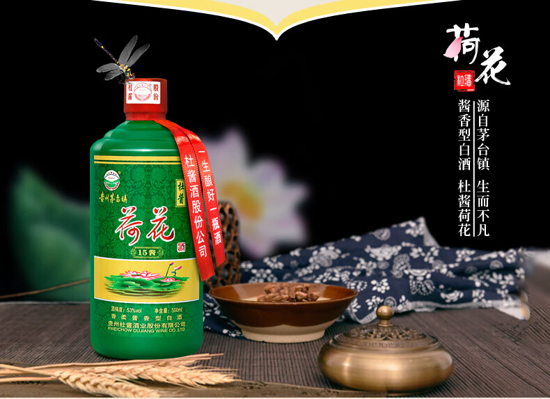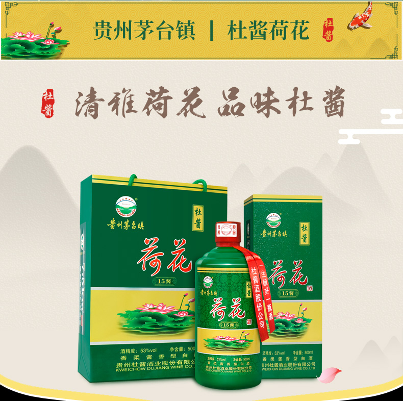 包装:整箱装;容量:500-749mL;香型:酱香型;产地:贵州;度数:50度及以上;酒精度:53%vol;容量:500ml;产品重量:5900g;包装清单:杜酱荷花酒 15酱 500ml*6整箱装;