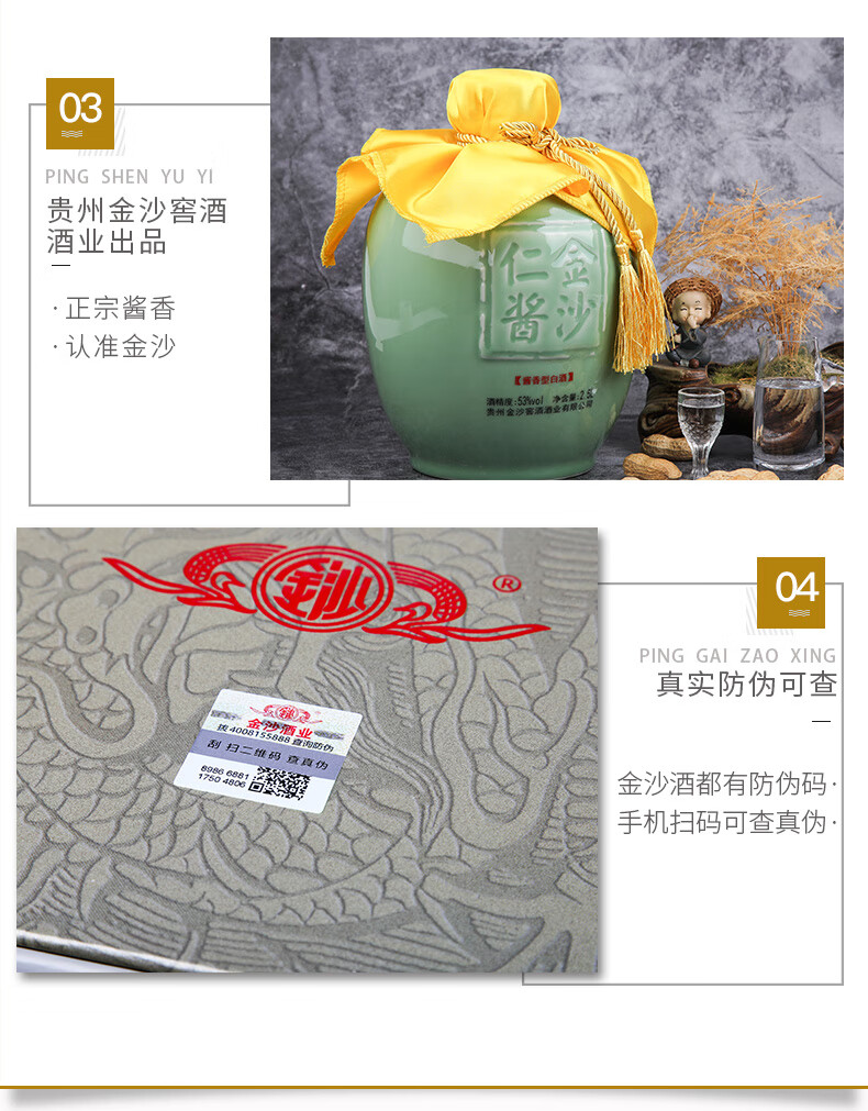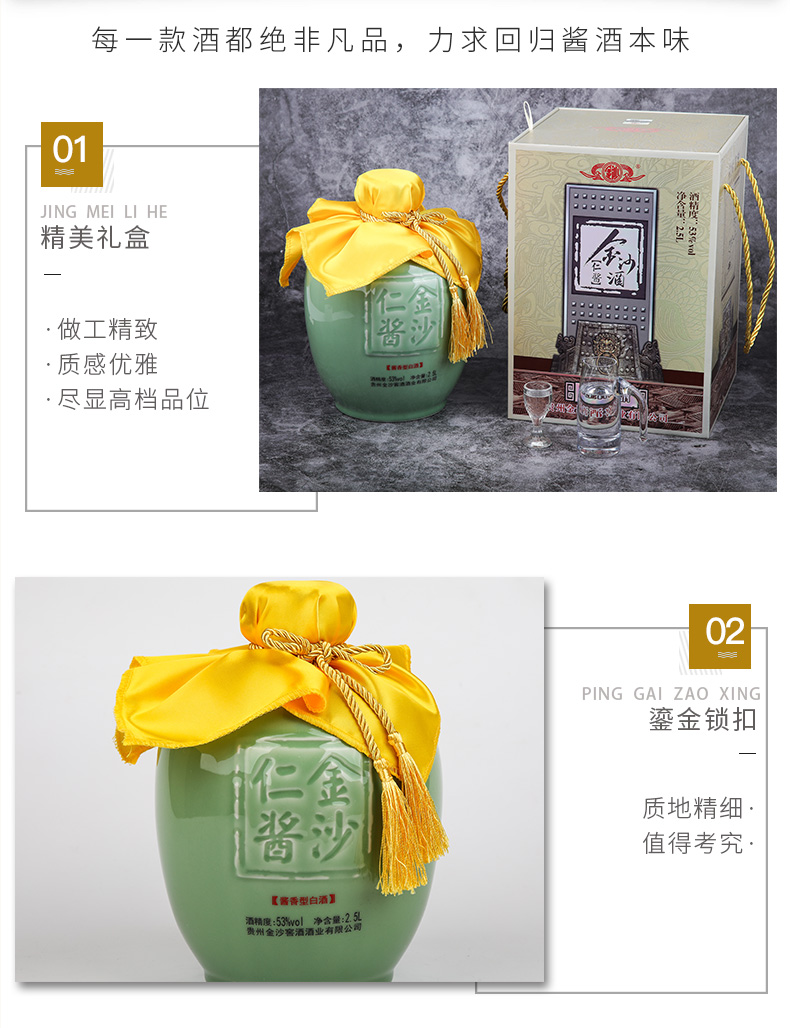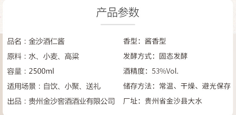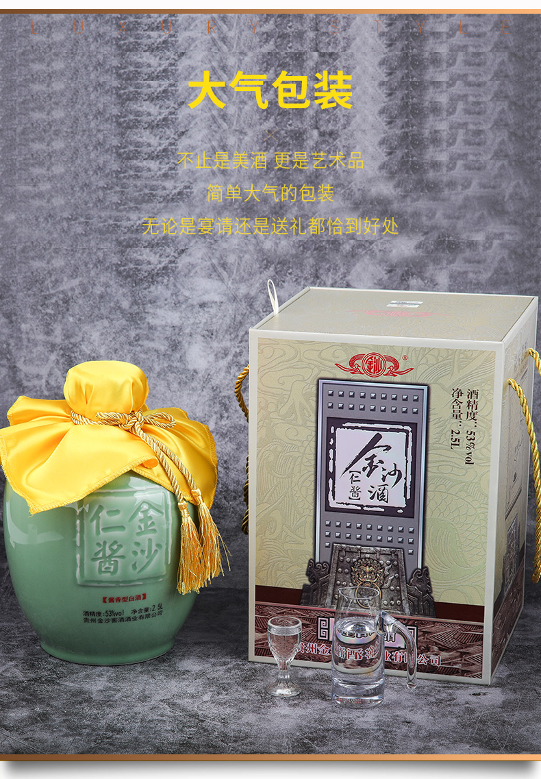 包装:瓶装;容量:750mL及以上;香型:酱香型;产地:贵州;度数:50度及以上;酒精度:53%vol;容量:5000ml;产品重量:5000g;包装清单:金沙坛酒 2.5L*1;