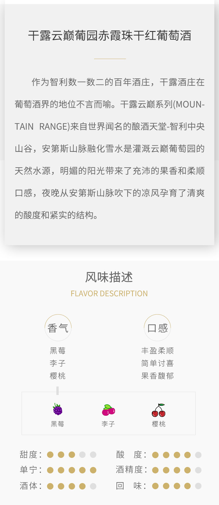 口感:强劲;特性:普通餐酒;国产/进口:进口;产地:智利;适用场景:家庭聚会,自斟自饮;包装:整箱装;容量:750mL;甜度:干型;类别:红葡萄酒;葡萄品种:赤霞珠(Cabernet Sauvignon);保质期:无;酒精度:以包装为准;原产地:智利;存储方法:常温、避光、卧放;容量:750ml*6;产品重量:7.01kg;包装清单:葡萄酒 750ml*6;