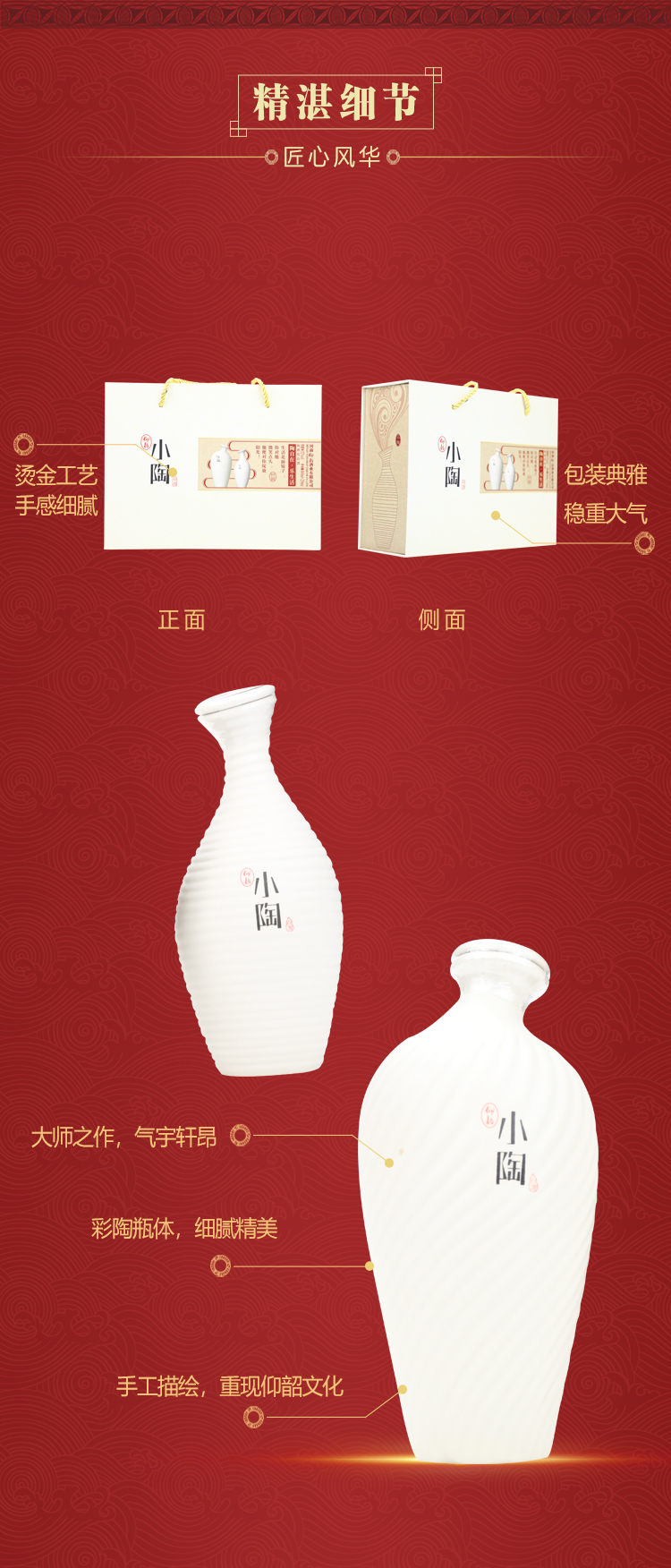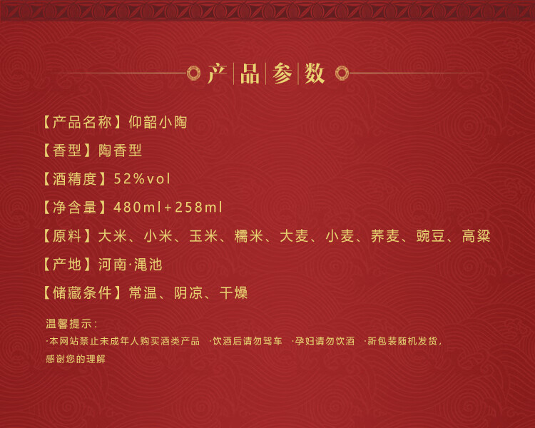 包装:礼盒装;容量:500-749mL;香型:其它;产地:河南;度数:50度及以上;酒精度:52%vol;容量:480+258ml;产品重量:2.3g;包装清单:仰韶 小陶 白酒 礼盒装 52度 两瓶 480ml+258ml;