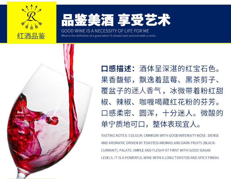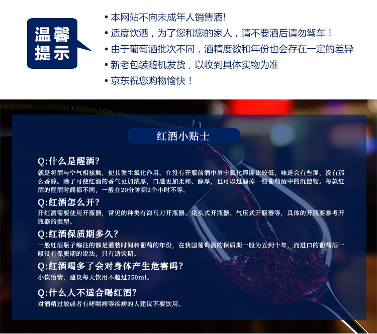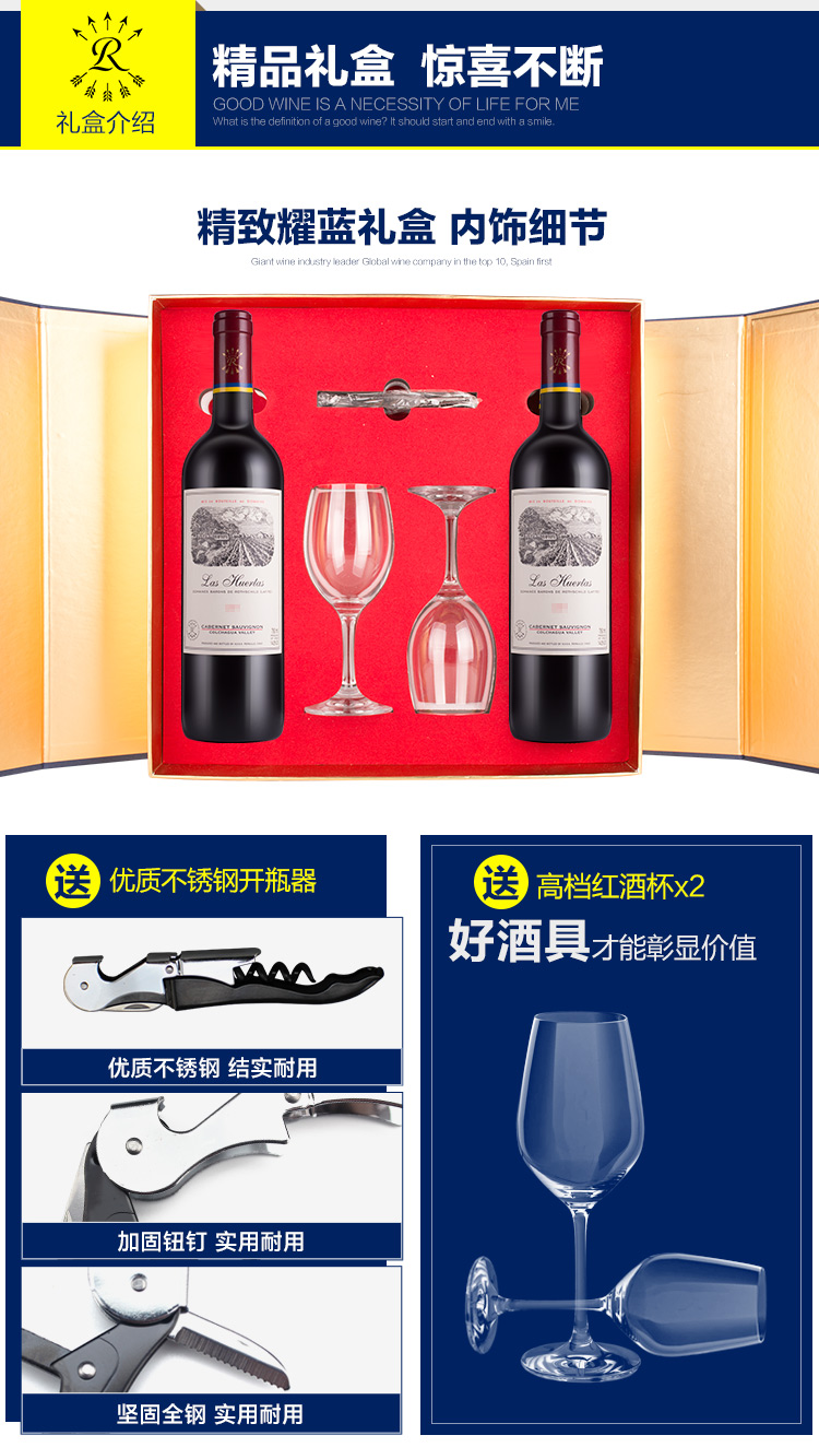 口感:强劲;特性:精品葡萄酒;国产/进口:进口;产地:智利;适用场景:礼节拜访,情侣约会;包装:礼盒装;容量:750mL;甜度:干型;类别:红葡萄酒;葡萄品种:其它;保质期:见背标;酒精度:14(仅供参考);原产地:智利;存储方法:避光、卧放;容量:750ml;产品重量:4.2kg;包装清单:酒杯*2、酒刀*1、耀蓝礼盒*1、手提袋*1、葡萄酒*2;