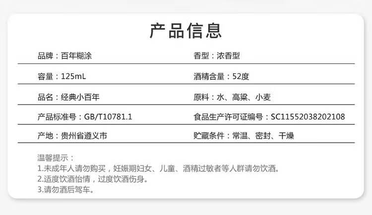 包装:瓶装;容量:375mL及以下;香型:浓香型;产地:贵州;度数:50度及以上;酒精度:52%vol;容量:125ml;产品重量:298g;包装清单:无;