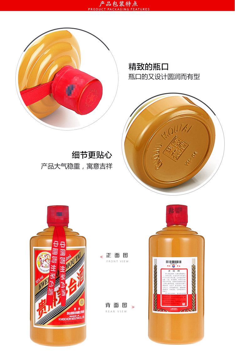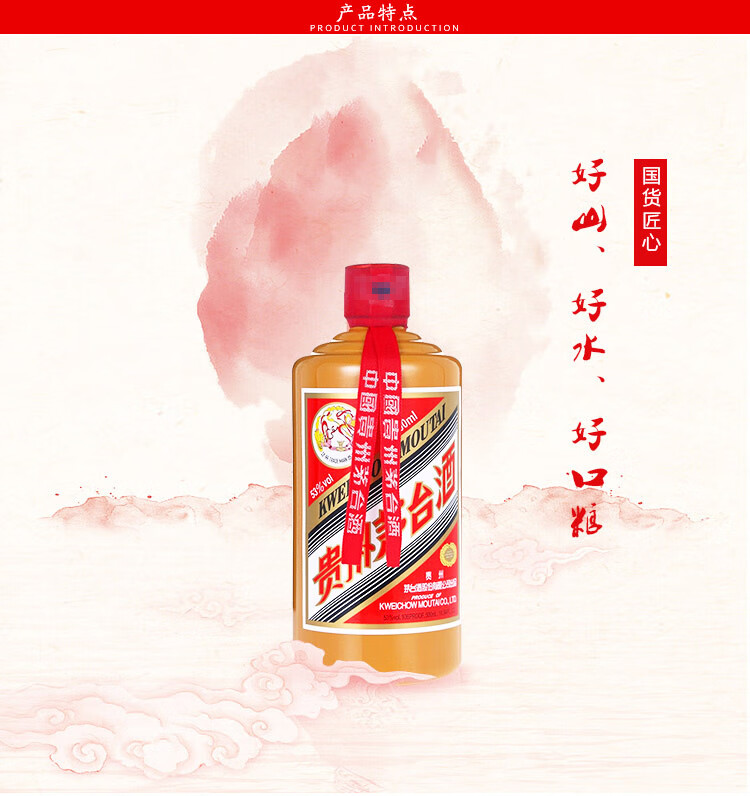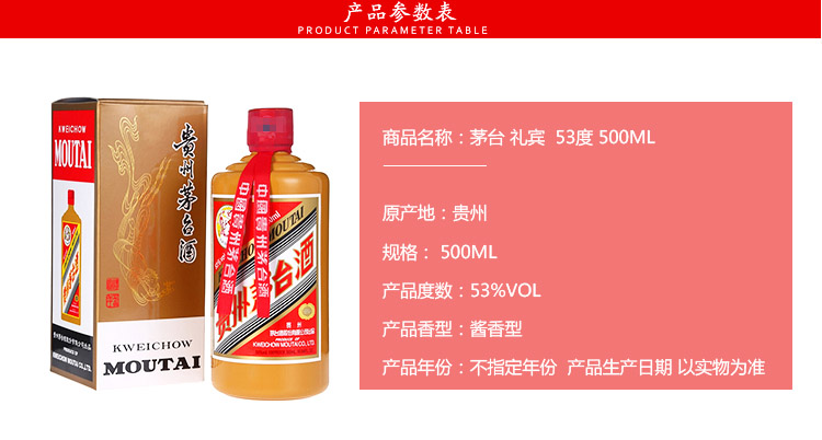 包装:瓶装;容量:376-499mL;香型:酱香型;产地:贵州;度数:50度及以上;酒精度:53%vol;容量:500ml;产品重量:500g;包装清单:茅台 礼宾 53度 500ml 单瓶装 酱香型白酒*1;