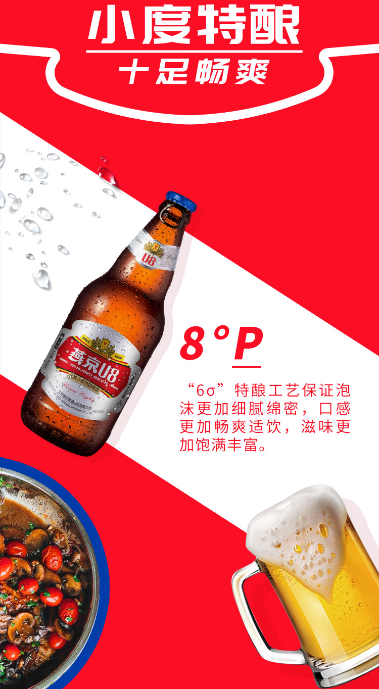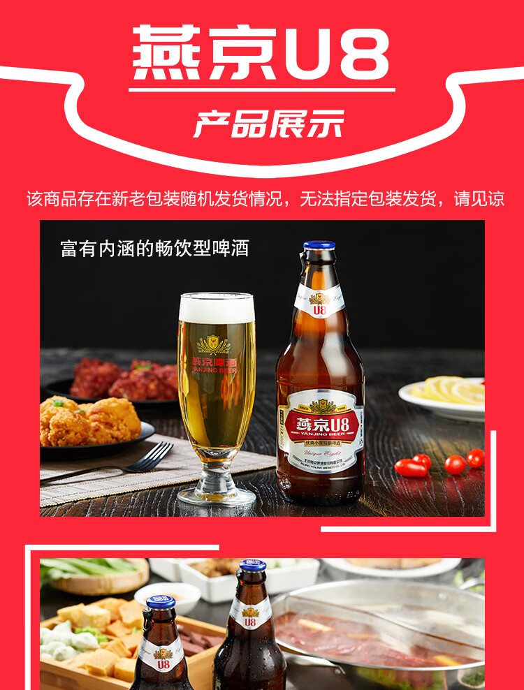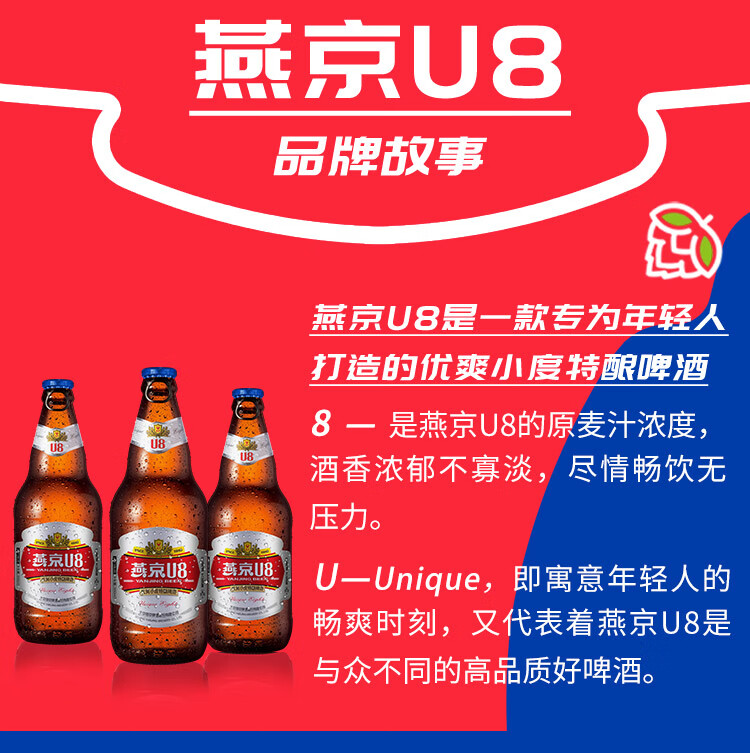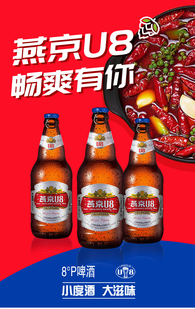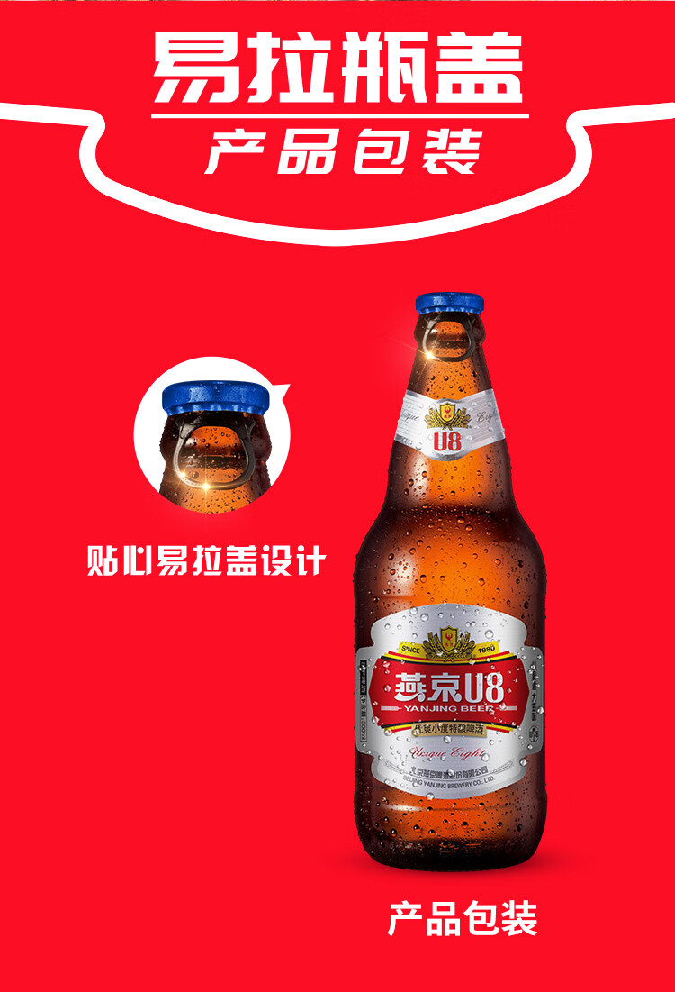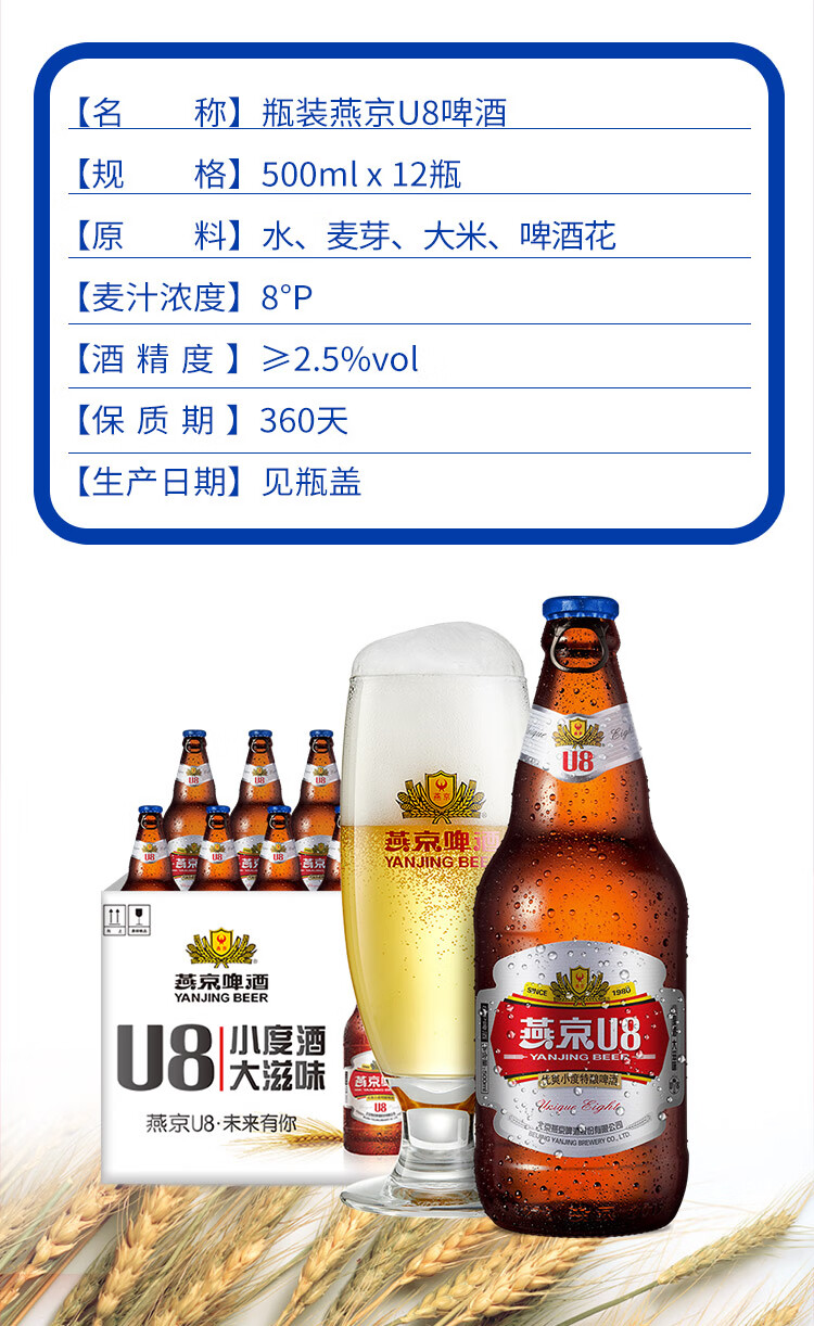 国产/进口:国产;产地:中国大陆;适用场景:野餐出游,礼节拜访,家庭聚会,自斟自饮,情侣约会,烧烤撸串,派对必备,酒吧夜店;包装:瓶装;容量:500mL;类别:黄啤酒;原料:水、麦芽、大米、啤酒花;保质期:360天;酒精度:≥2.5%vol;原产地:中国大陆;原麦汁浓度:8°P;存储方法:5℃-25℃, 避光贮运;产品重量:12kg;容量:500ml;包装清单:燕京啤酒 8度 小度酒U8啤酒500ml*12瓶整箱装;