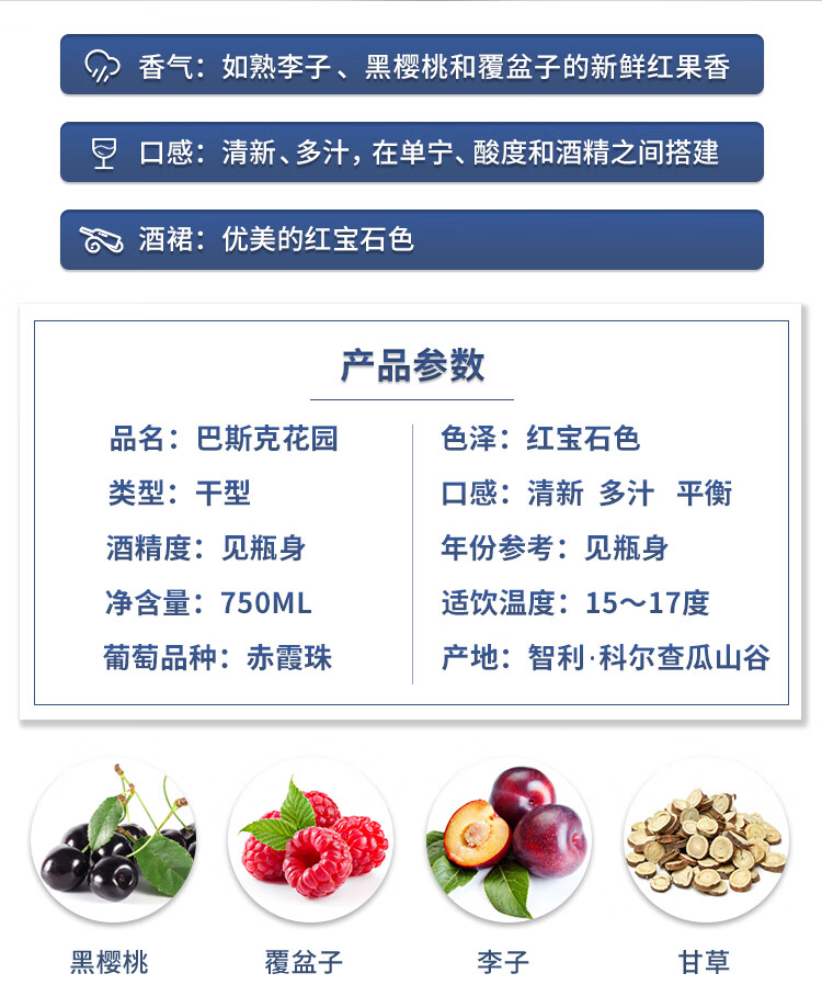 口感:柔和;特性:其它;国产/进口:进口;适用场景:礼节拜访,商务宴请,婚礼婚宴,情侣约会,家庭聚会,收藏,自斟自饮;包装:整箱装;酸度:中酸;类别:红葡萄酒;葡萄品种:赤霞珠(Cabernet Sauvignon);类型:静止酒;香型:香料,木香,烘烤,花香,植物,果香;产地:智利;容量:750mL;甜度:干型;保质期:10年;酒精度:14%vol;原产地:智利;存储方法:平放或倒置于阴凉避光处;容量:750ml*6;产品重量:7.32kg;包装清单:巴斯克花园红葡萄酒750ml*6;