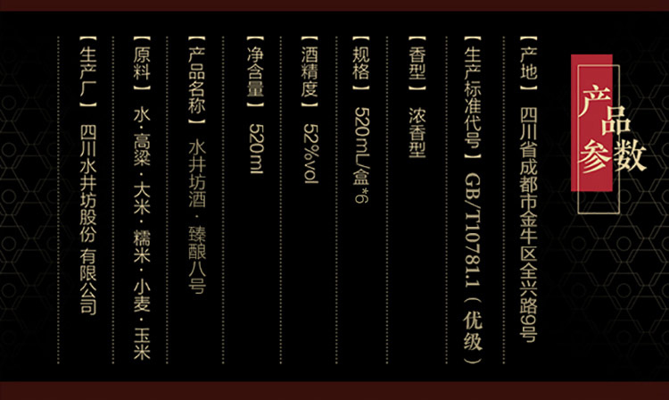 包装:整箱装;容量:500-749mL;香型:浓香型;产地:四川;度数:50度及以上;酒精度:52%vol;容量:500ml;产品重量:9020g;包装清单:水井坊 臻酿八號 52度520ml*6瓶、礼品袋*3;