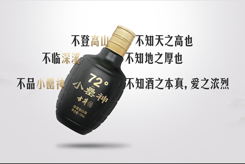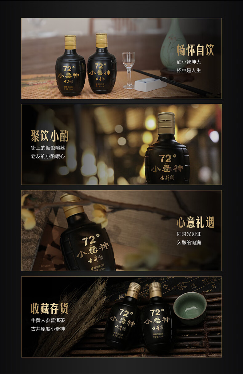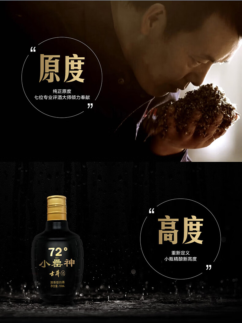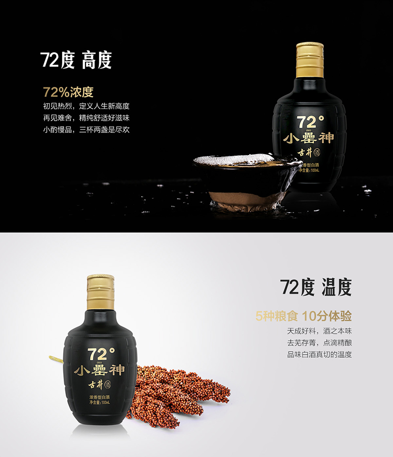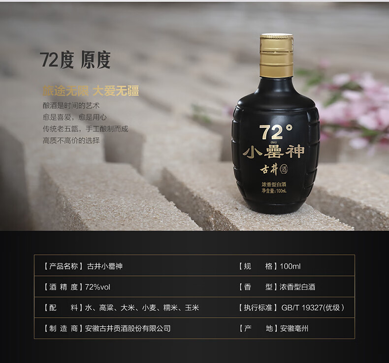 包装:整箱装;容量:375mL及以下;香型:浓香型;产地:其它;度数:50度及以上;酒精度:72%vol;容量:100;产品重量:3790g;包装清单:古井小罍神 72度100ml*12瓶 小瓶纯粮食高度白酒箱装 口感浓香型;